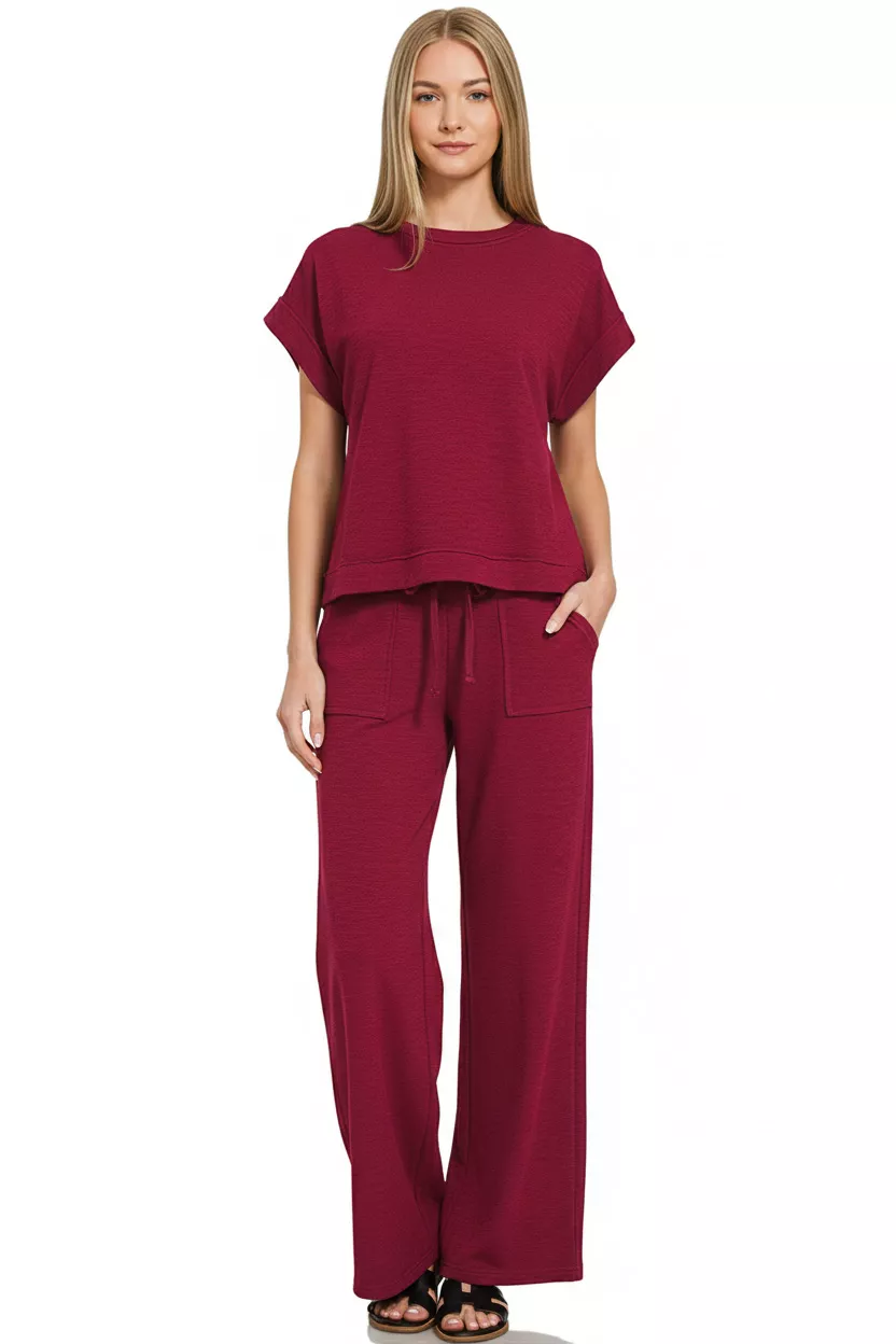 Zenana Cotton Slub Short Sleeve Tee and Pants Set