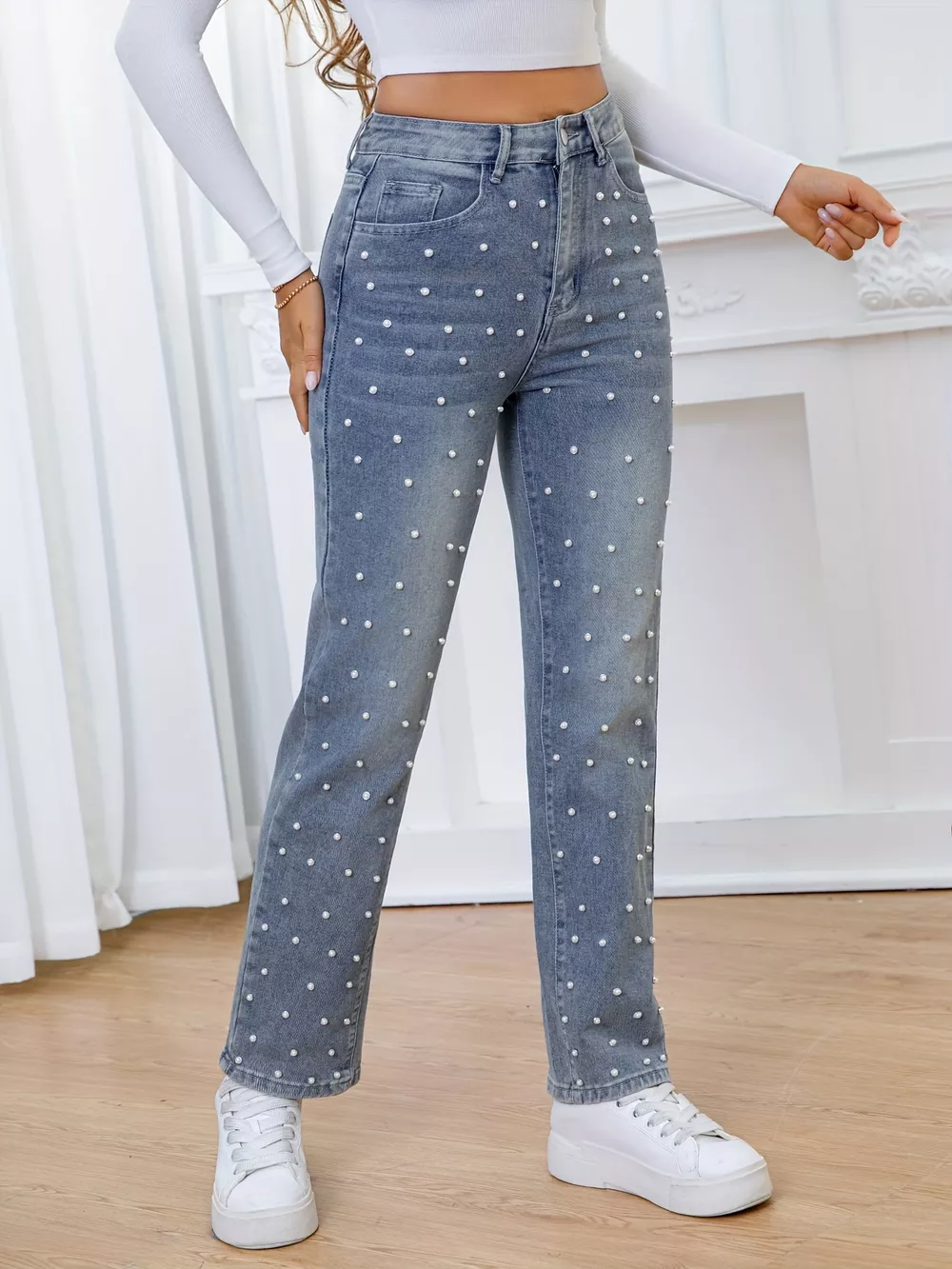 Pearl Embellished High Waist Straight Jeans