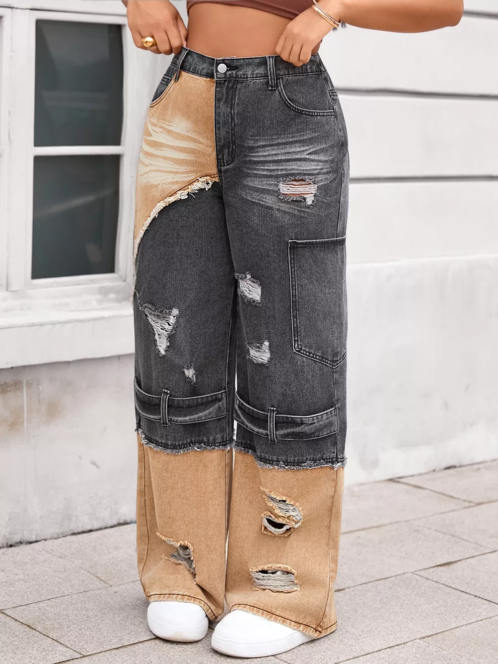 Two-Tone Ripped Wide Leg Jeans