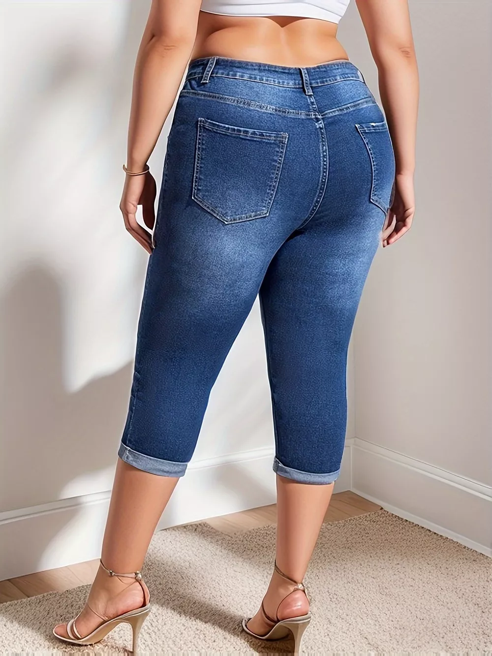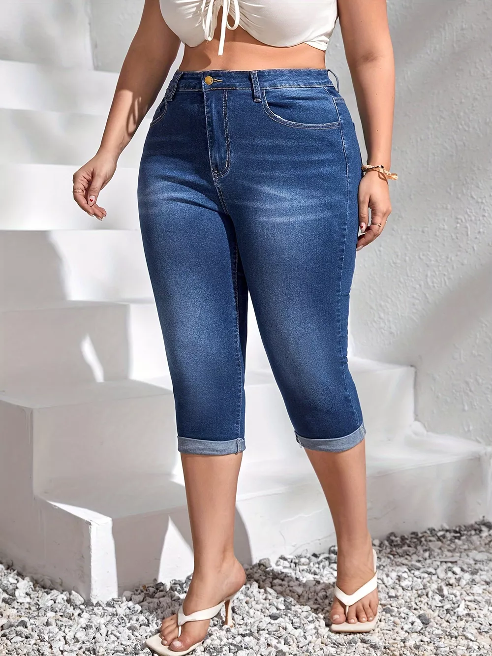 Plus Size Rolled Hem High Waist Denim Capri Jeans