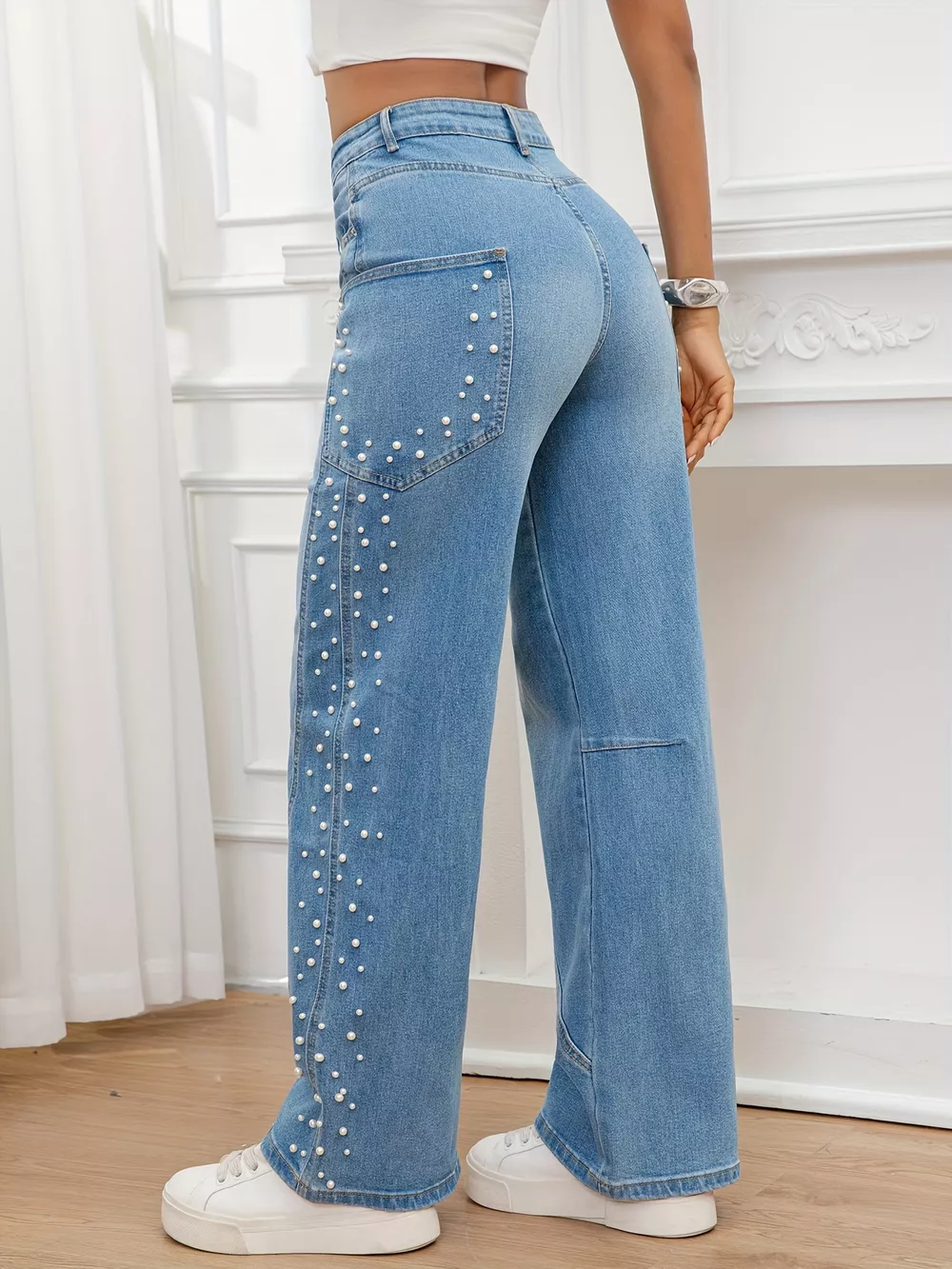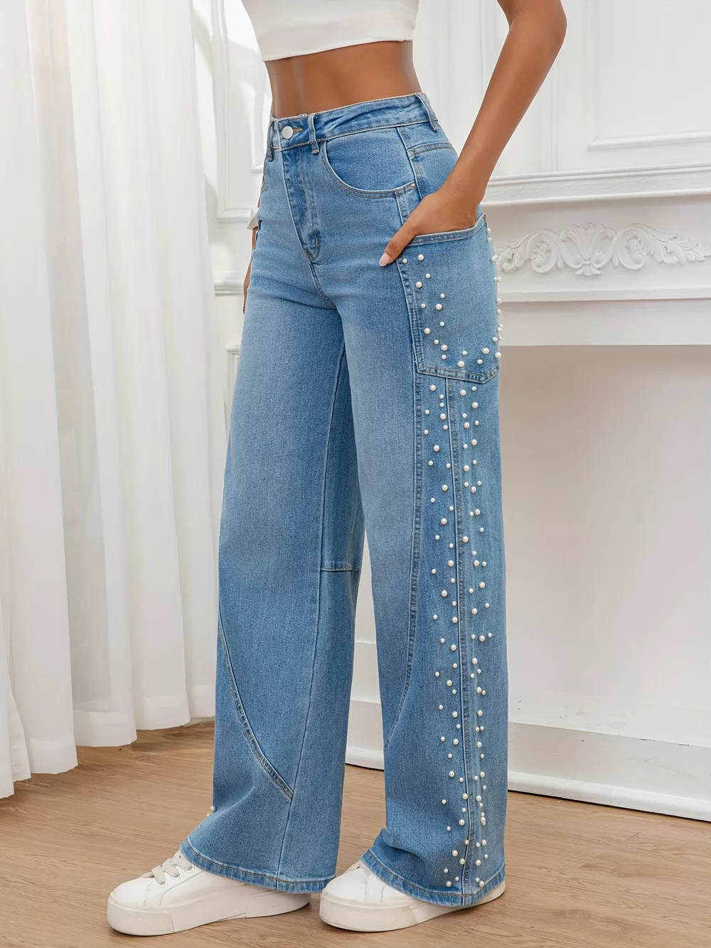Pearl Embellished Wide Leg Jeans