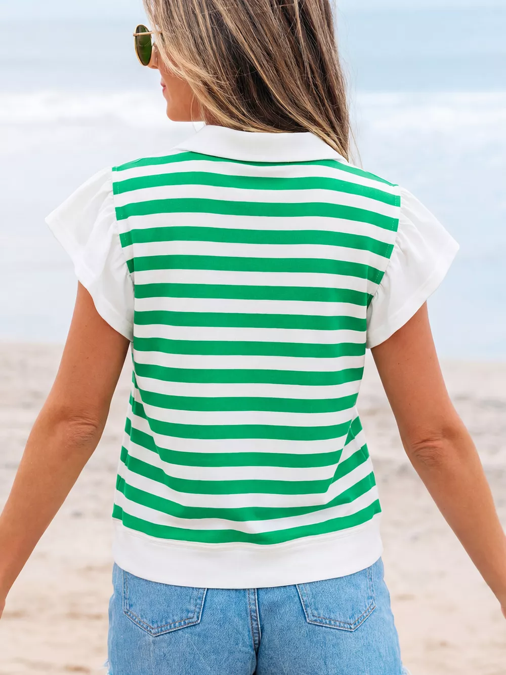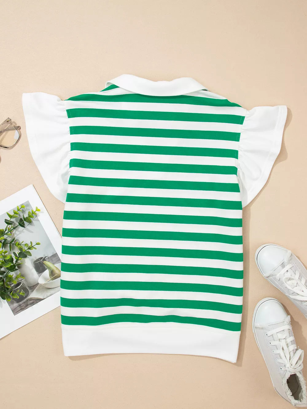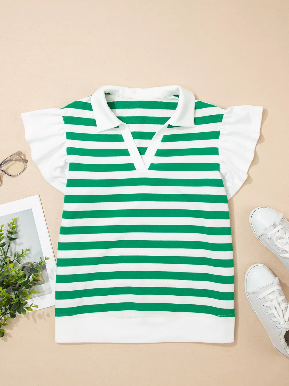 Stripe Collar V Neck Ruffled Short Sleeve Blouse