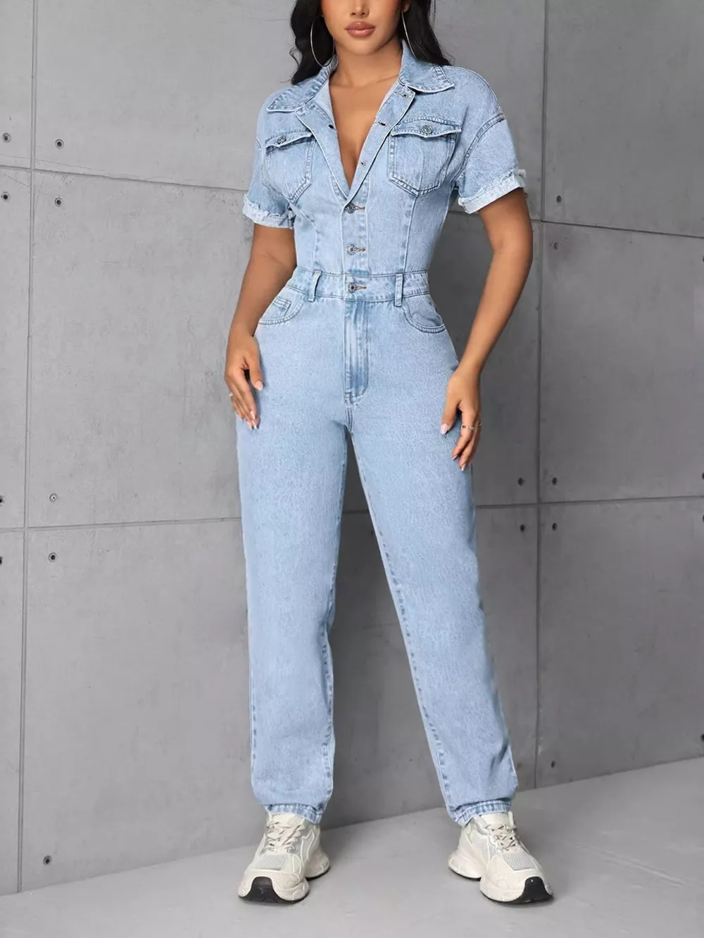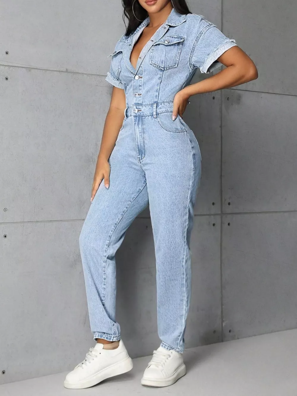 Button Front Short Sleeve Denim Jumpsuit