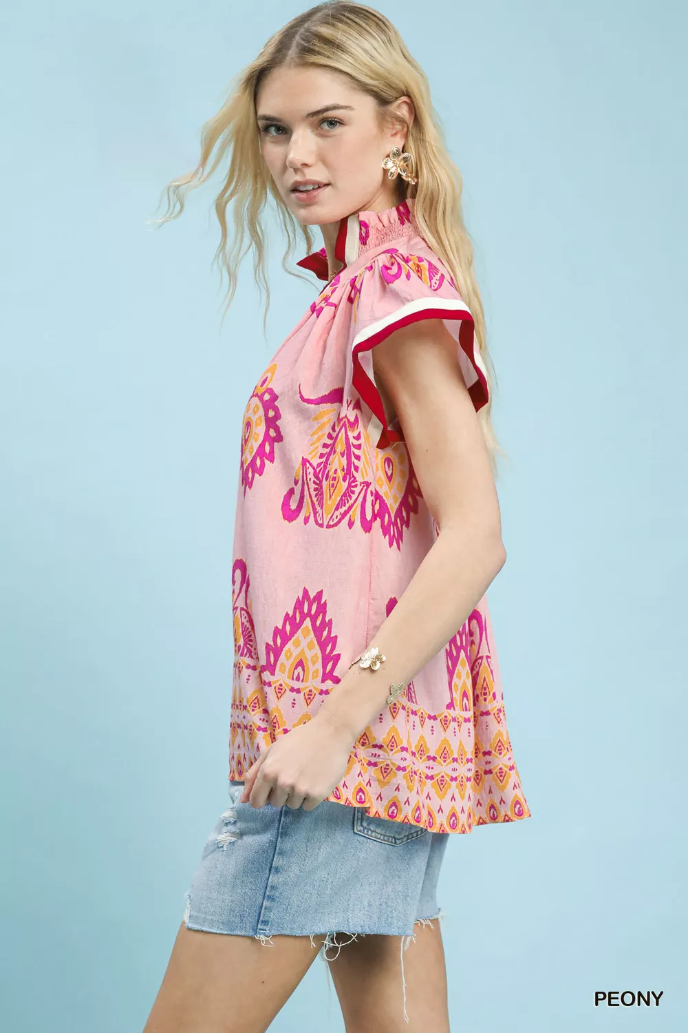 Umgee Border Print Split-Neck Boho Top