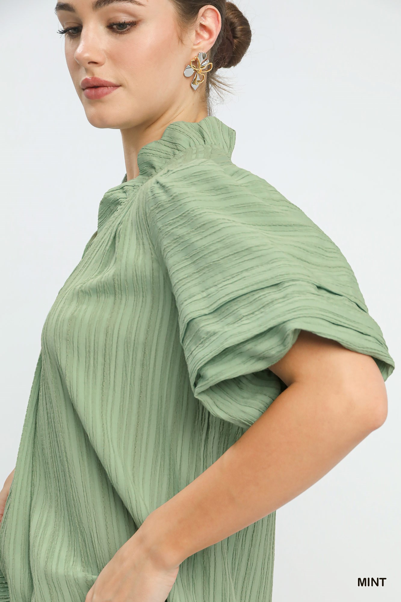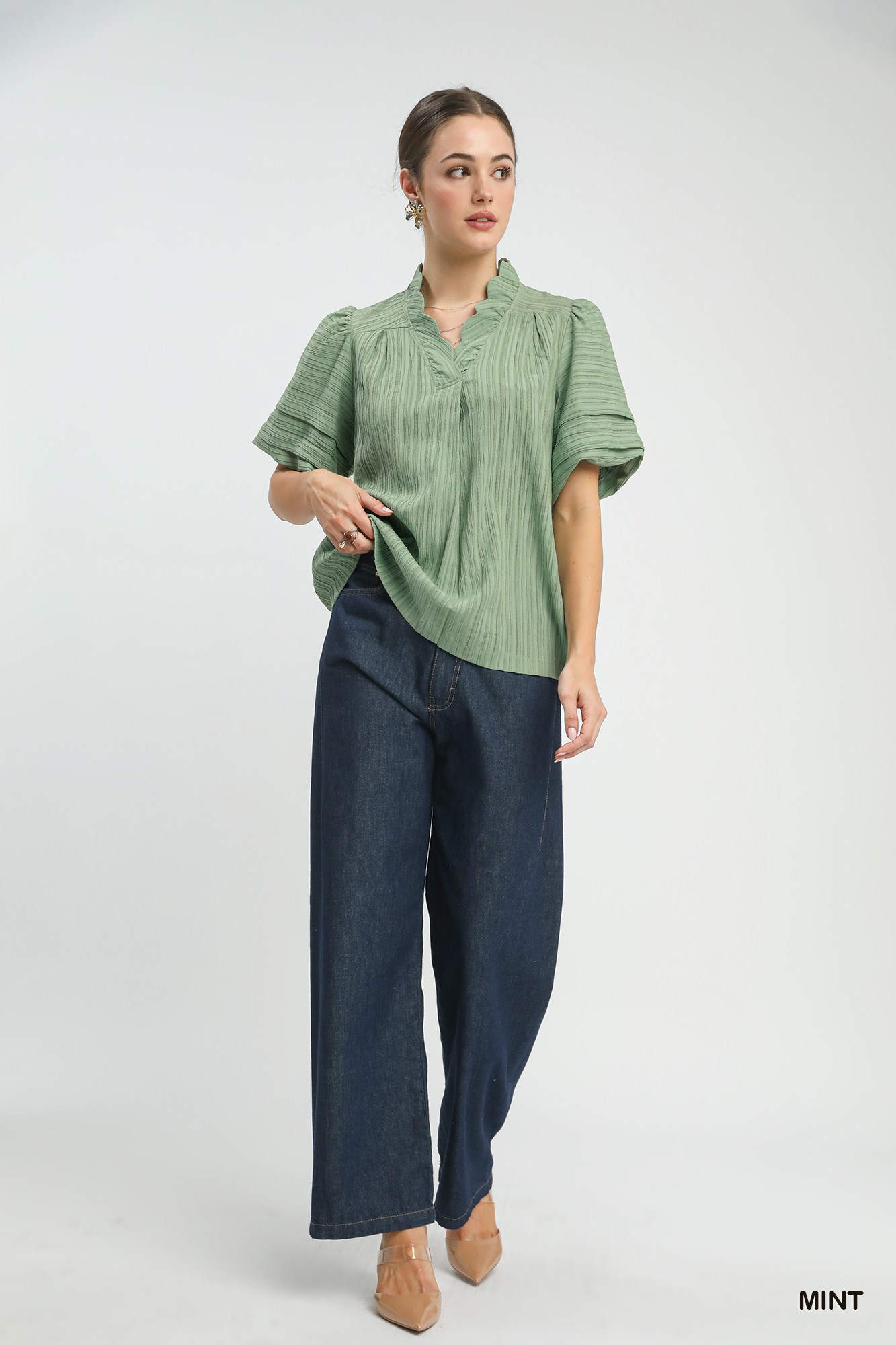 Umgee Seersucker Bubble Sleeve V-Neck Blouse