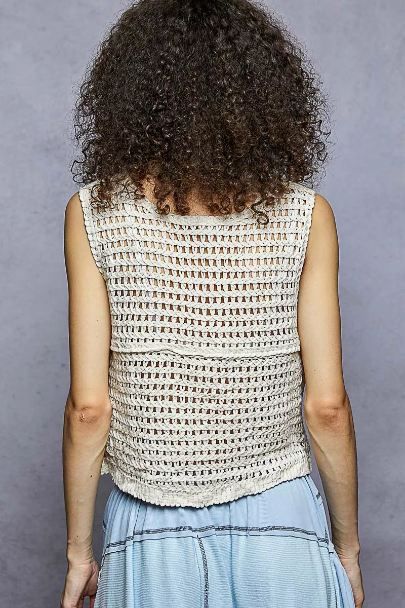 POL Button Down Floral Embroidery Cropped Crochet Vest Top