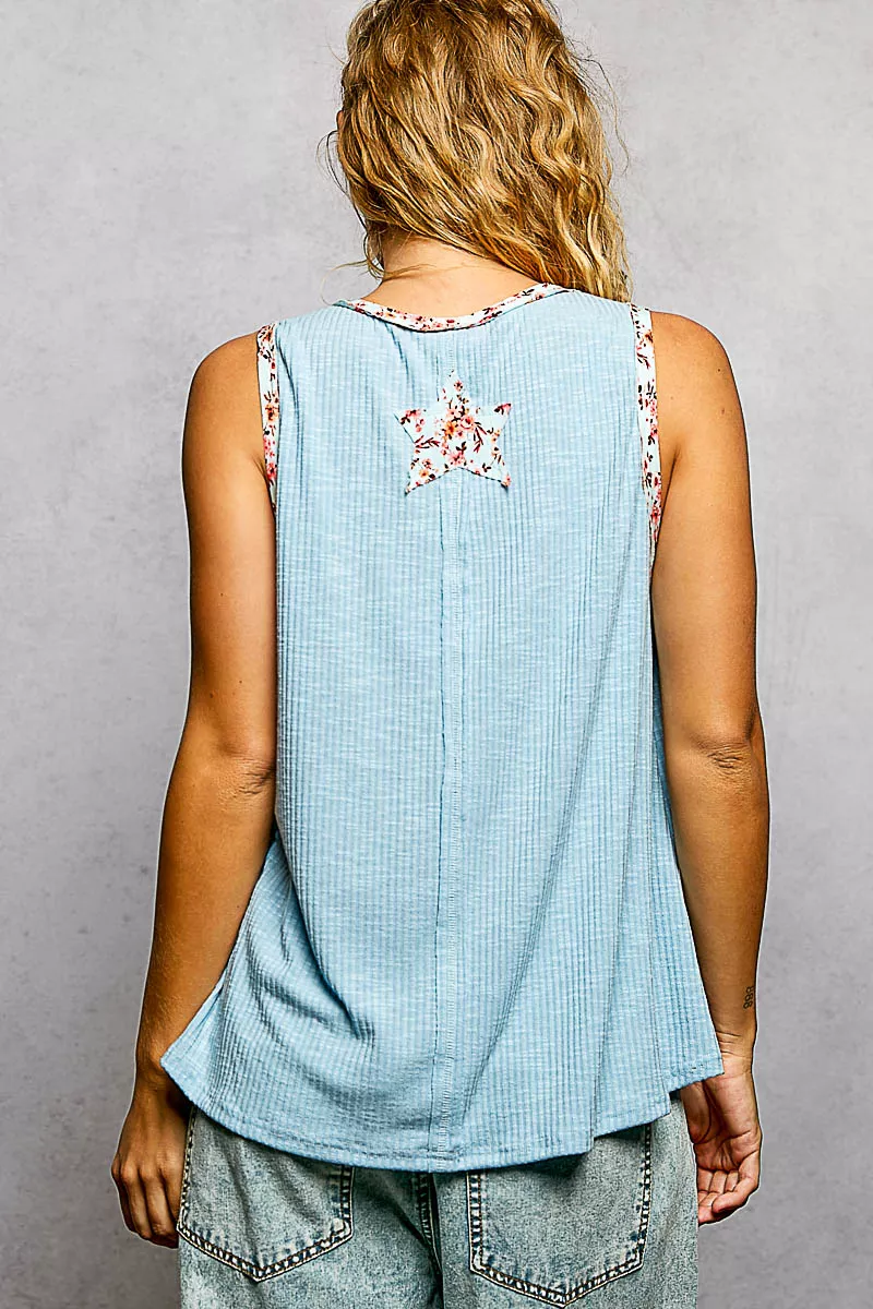 POL Washed Ribbed V-Neck Tank with Floral Print Star Patch