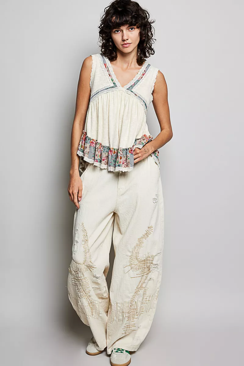 POL Lace Detail Ruffled Ribbed Sleeveless Top with Floral Pattern Trim Detail