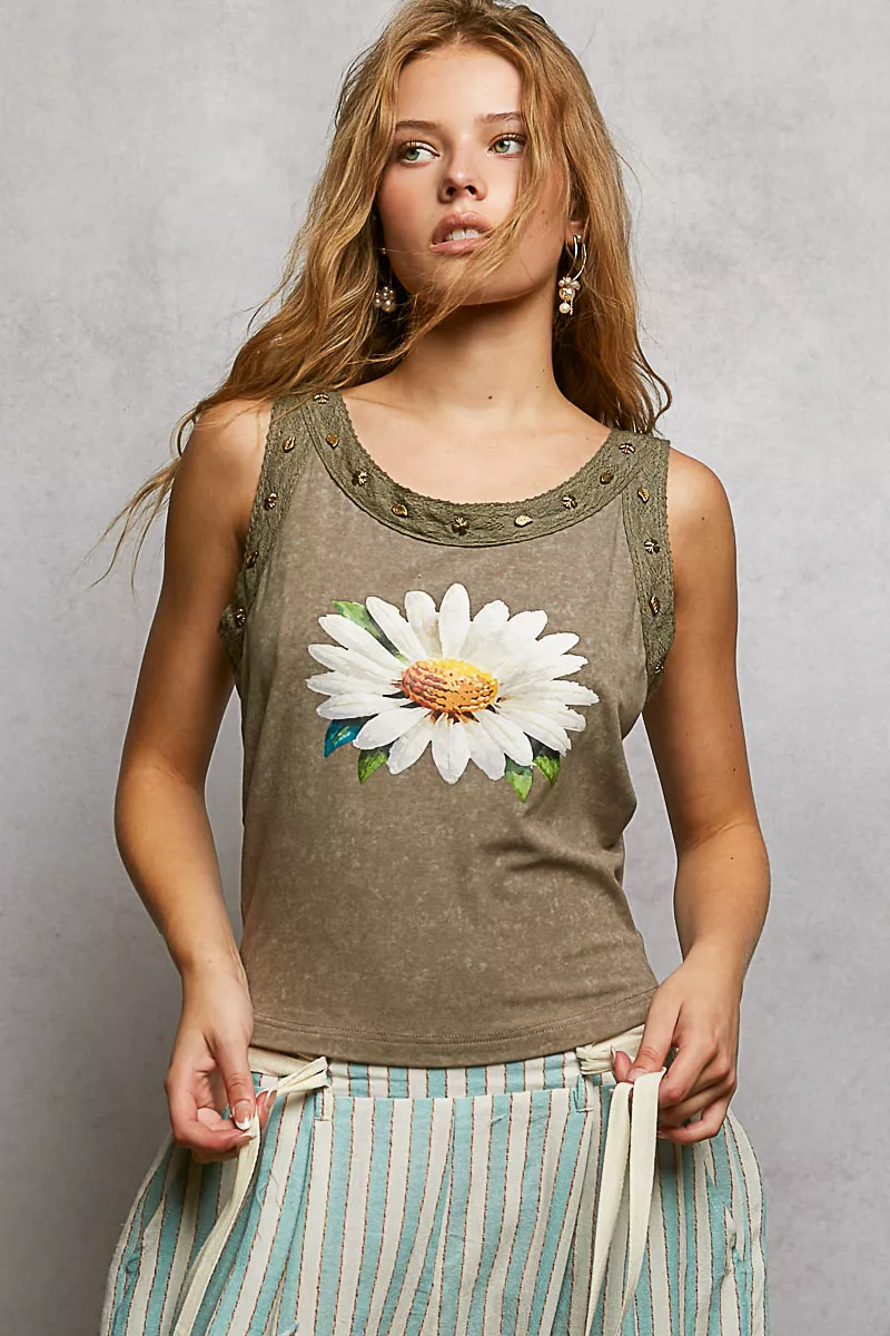 POL Washed Floral Stud Round Neck Slim Tank