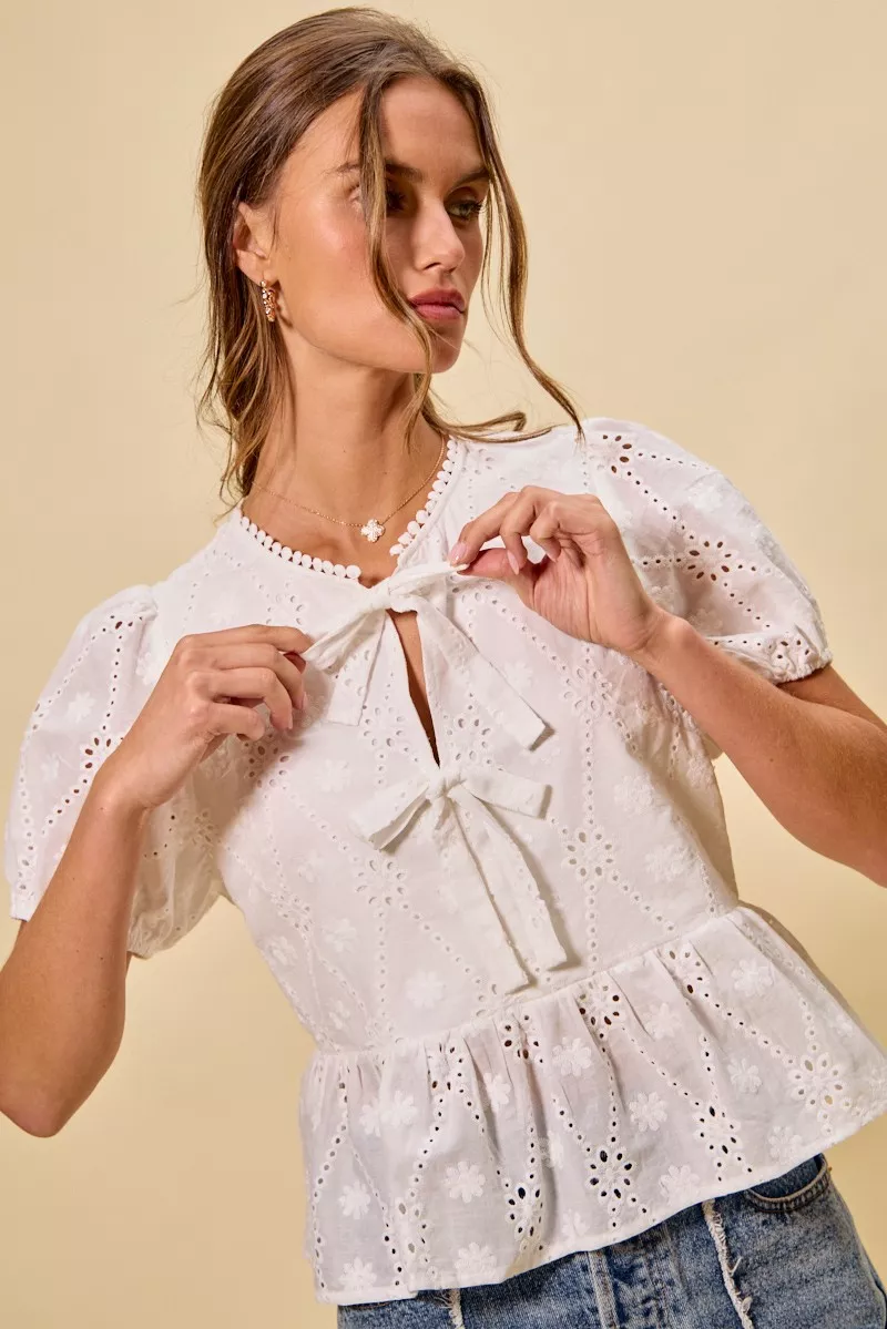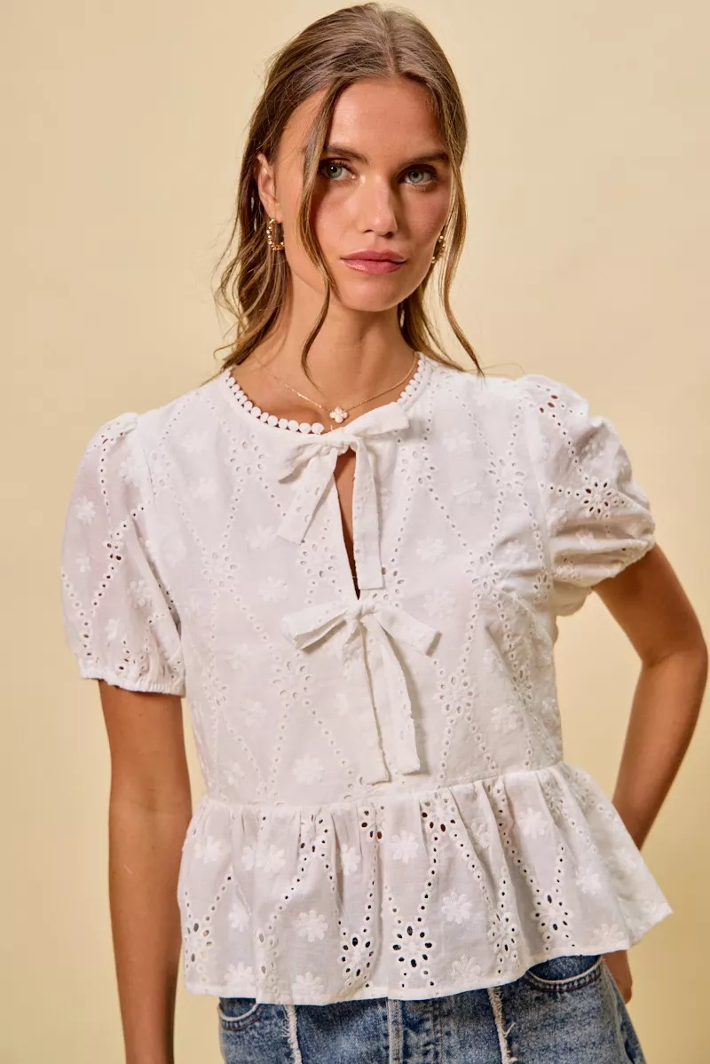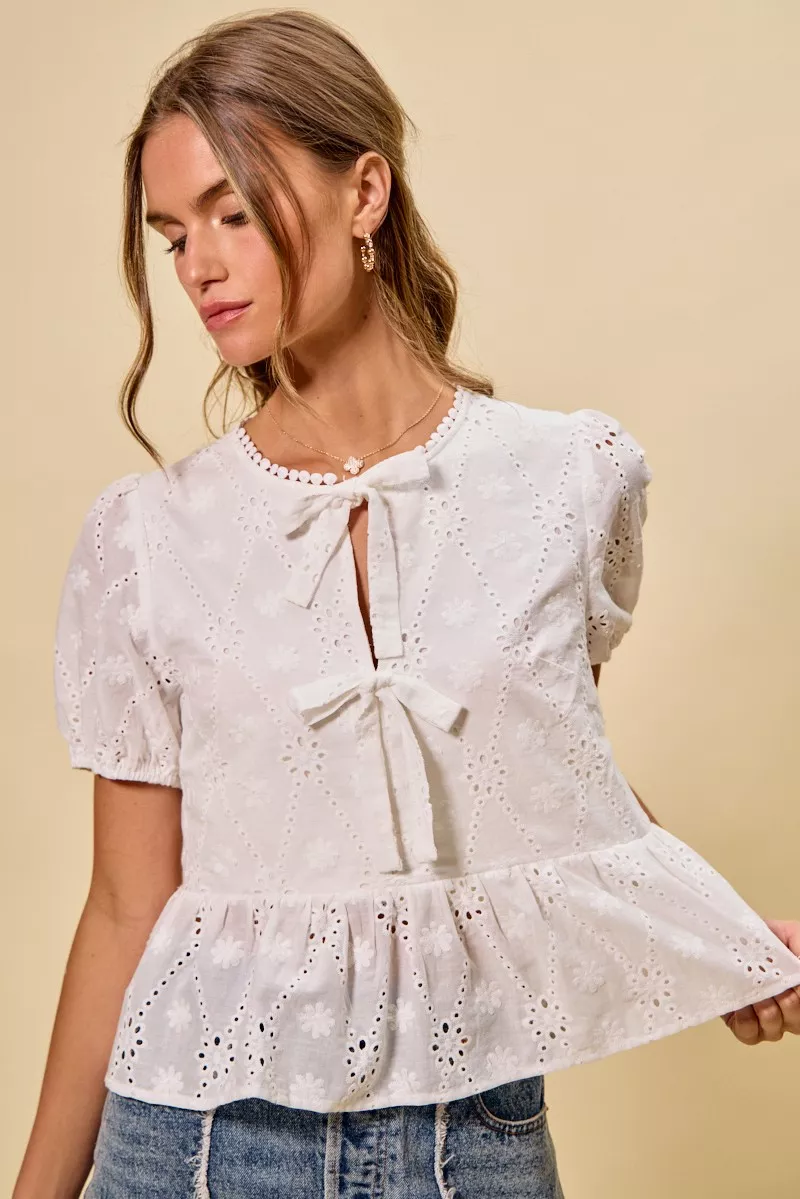 SO ME Cotton Eyelet Front Tie Short Sleeves Blouse
