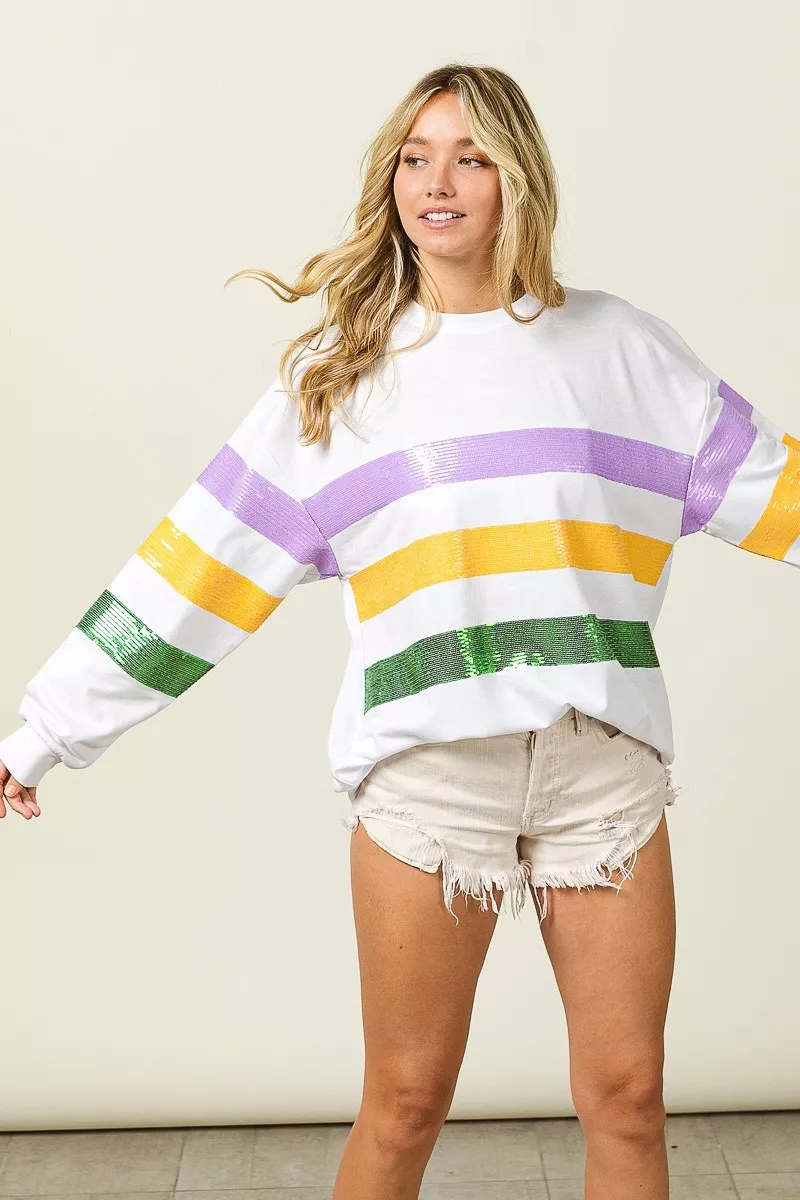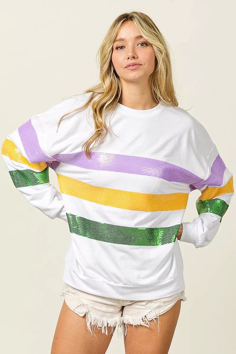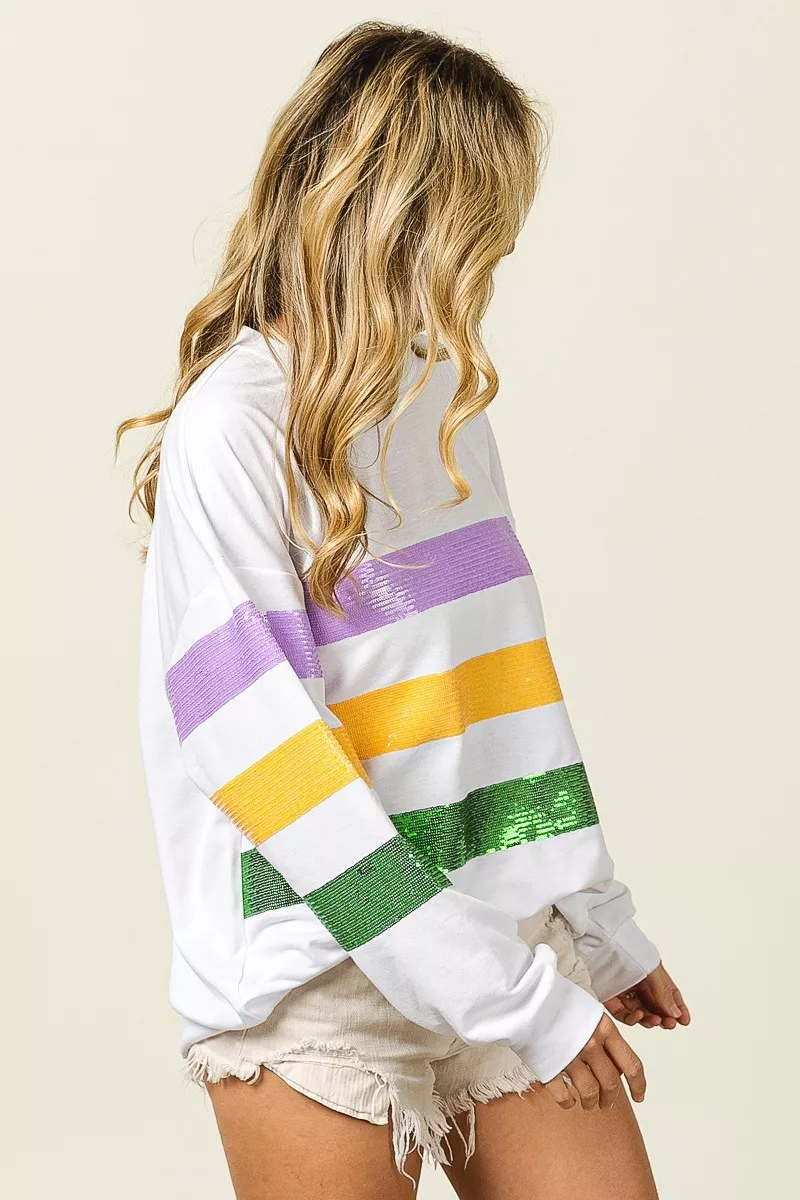 BiBi Sequin Mardi Gras Striped Round Neck Sweatshirt