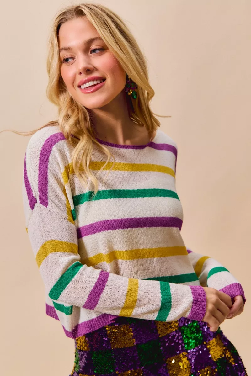 This lightweight sweater top features colorful Mardi Gras stripes, adding a festive touch to your outfit. Perfect for celebrating Mardi Gras or adding a pop of color to your wardrobe. The vibrant stripes give it a fun and playful look. Made of comfortable and breathable fabric, it's perfect for all-day wear. Stand out in style with this eye-catching Mardi Gras color stripe sweater top!