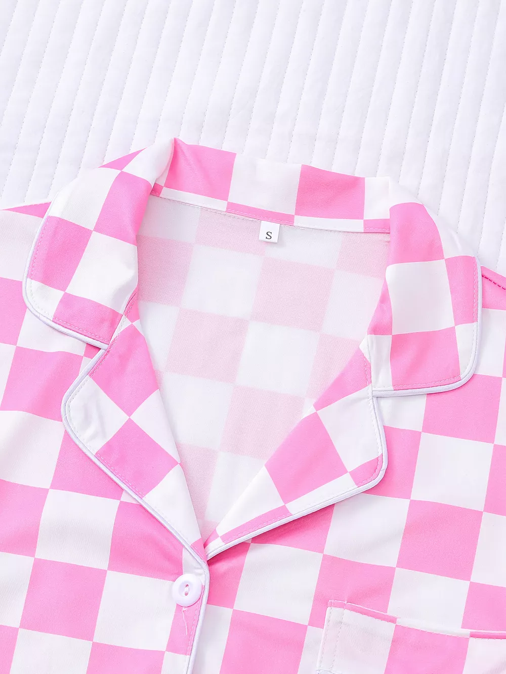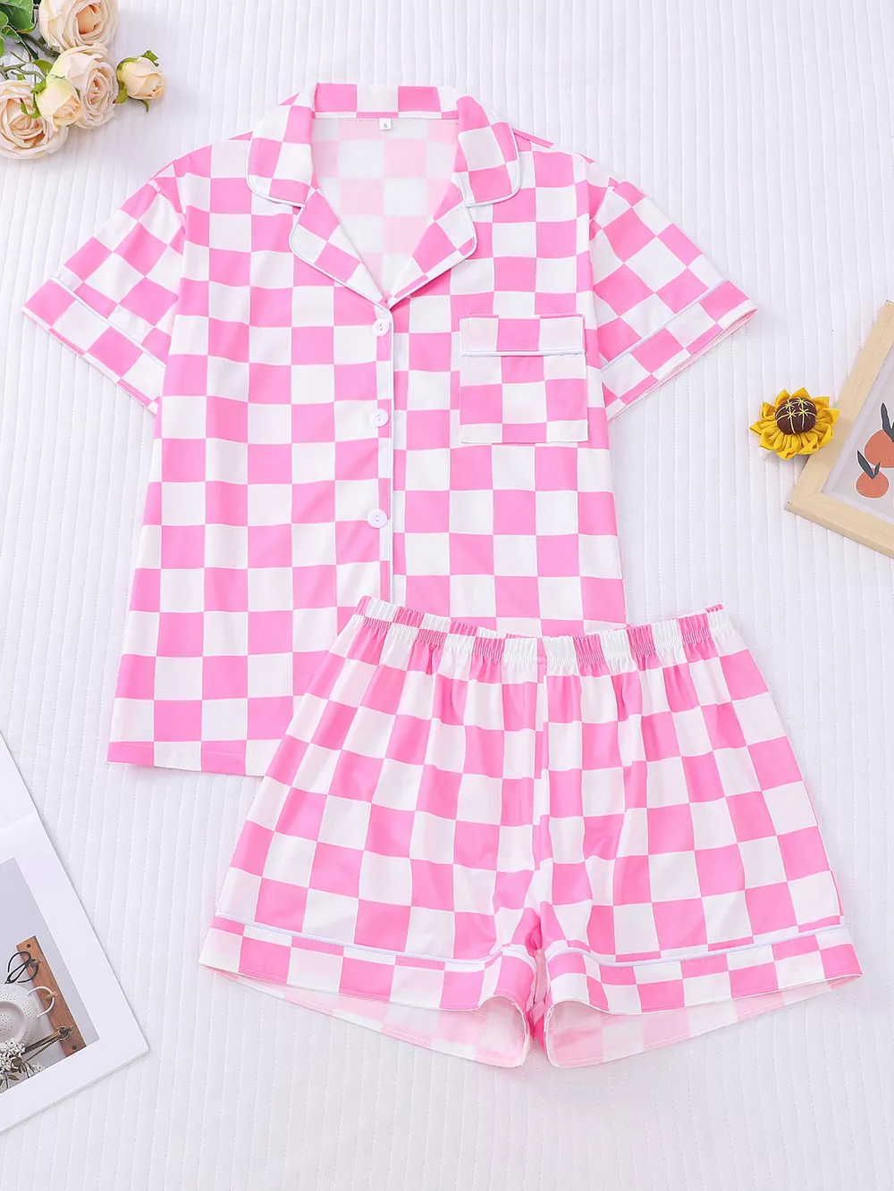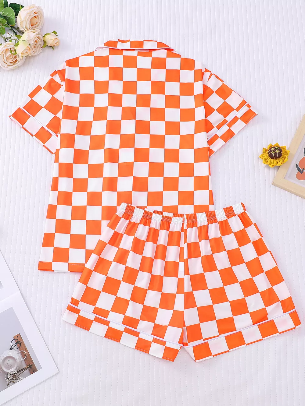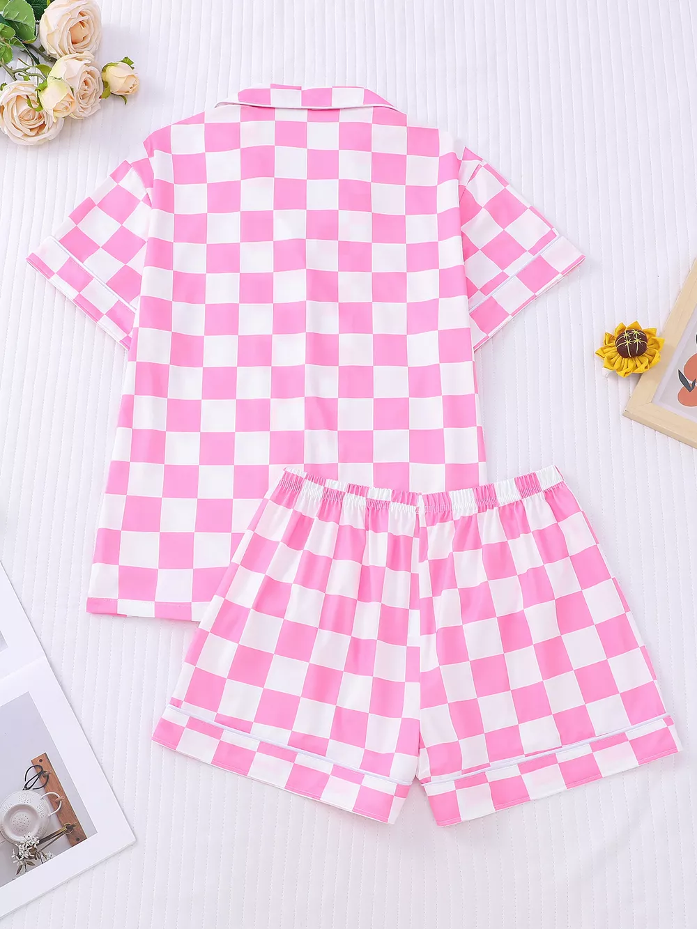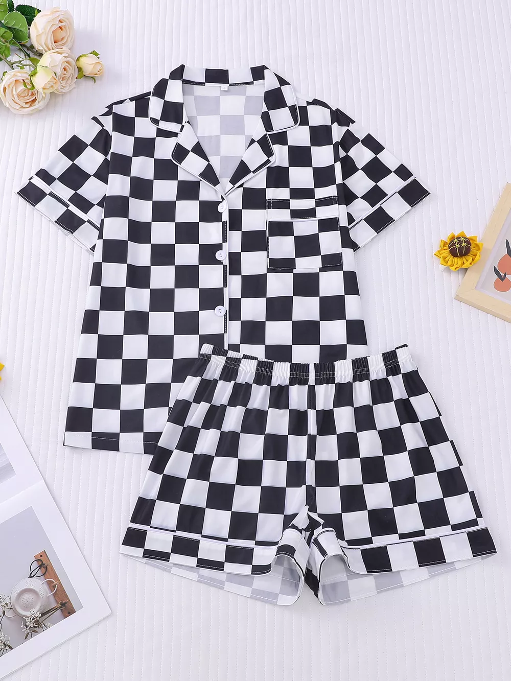 Checkered Print Button Up Top and Shorts Lounge Set