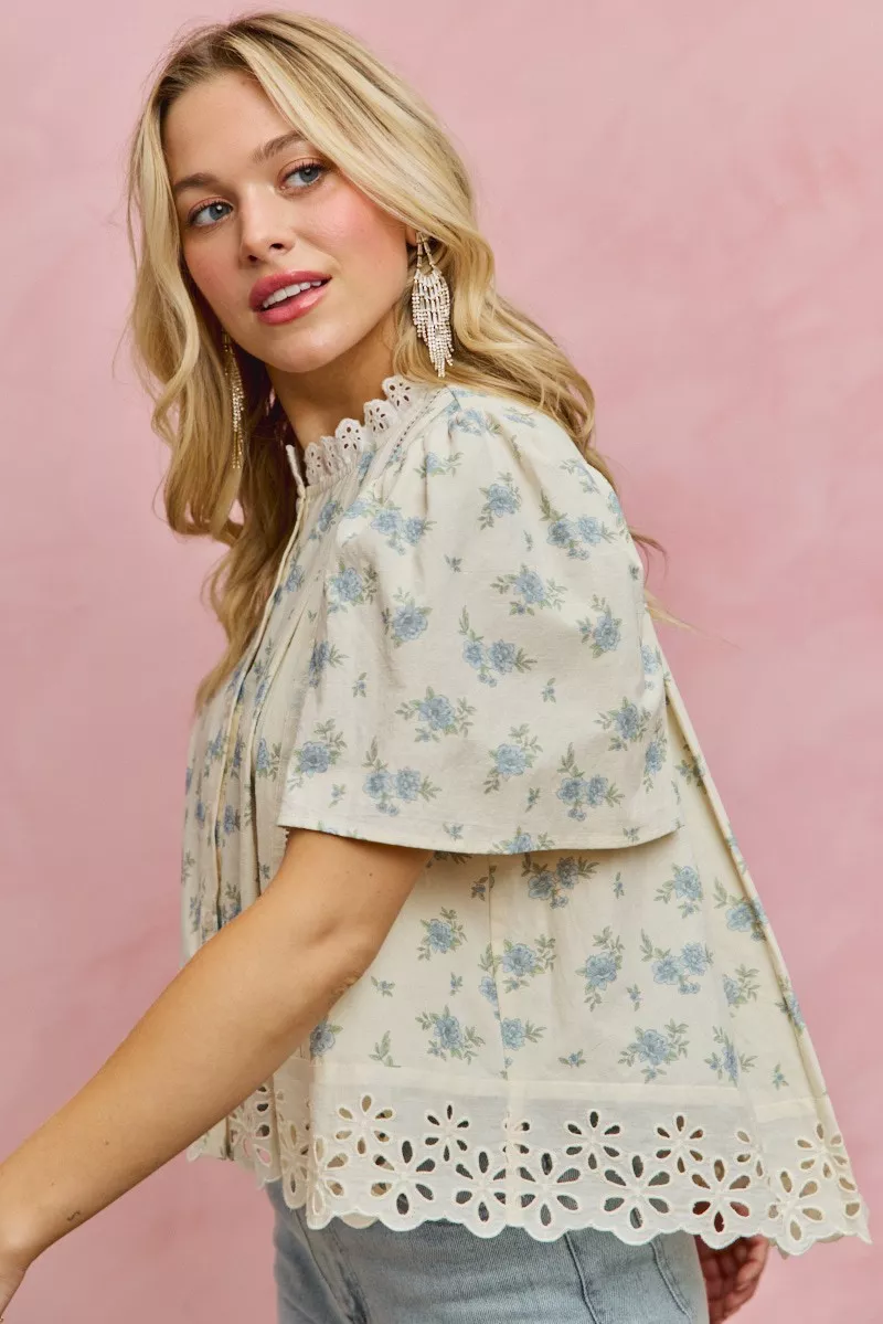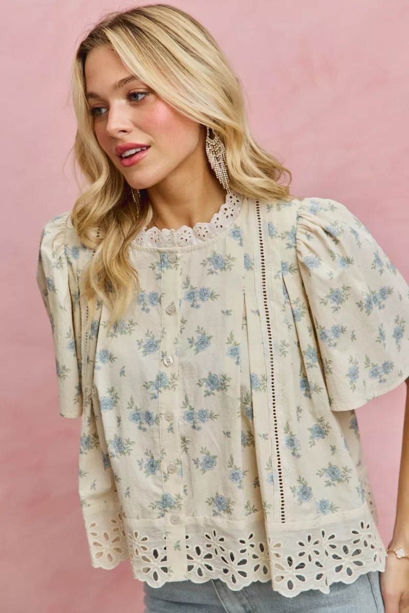 This blouse showcases a beautiful floral print with delicate lace trim detailing for a feminine and elegant touch. The flutter sleeves add a whimsical and romantic flair to the overall look. Perfect for adding a touch of charm to any outfit. Made of lightweight and comfortable fabric, it's ideal for all-day wear. Embrace your feminine side with this lovely floral print blouse featuring lace trim and flutter sleeves!