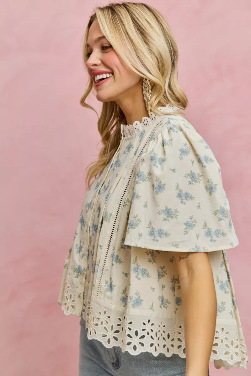 SO ME Floral Print Lace Trim Flutter Sleeves Blouse
