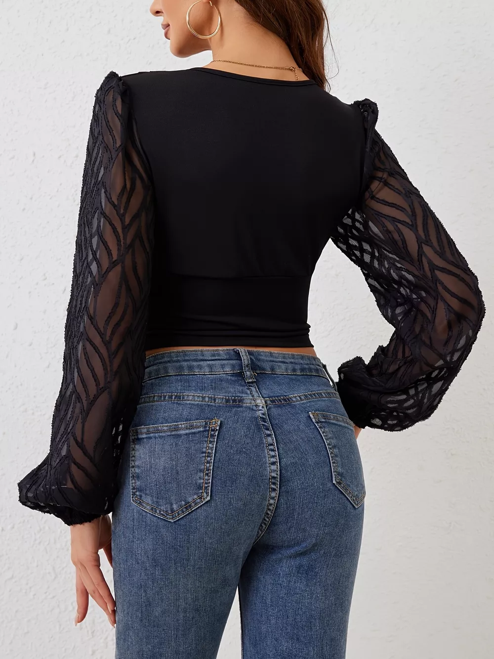 Sheer Sleeve V-Neck Blouse