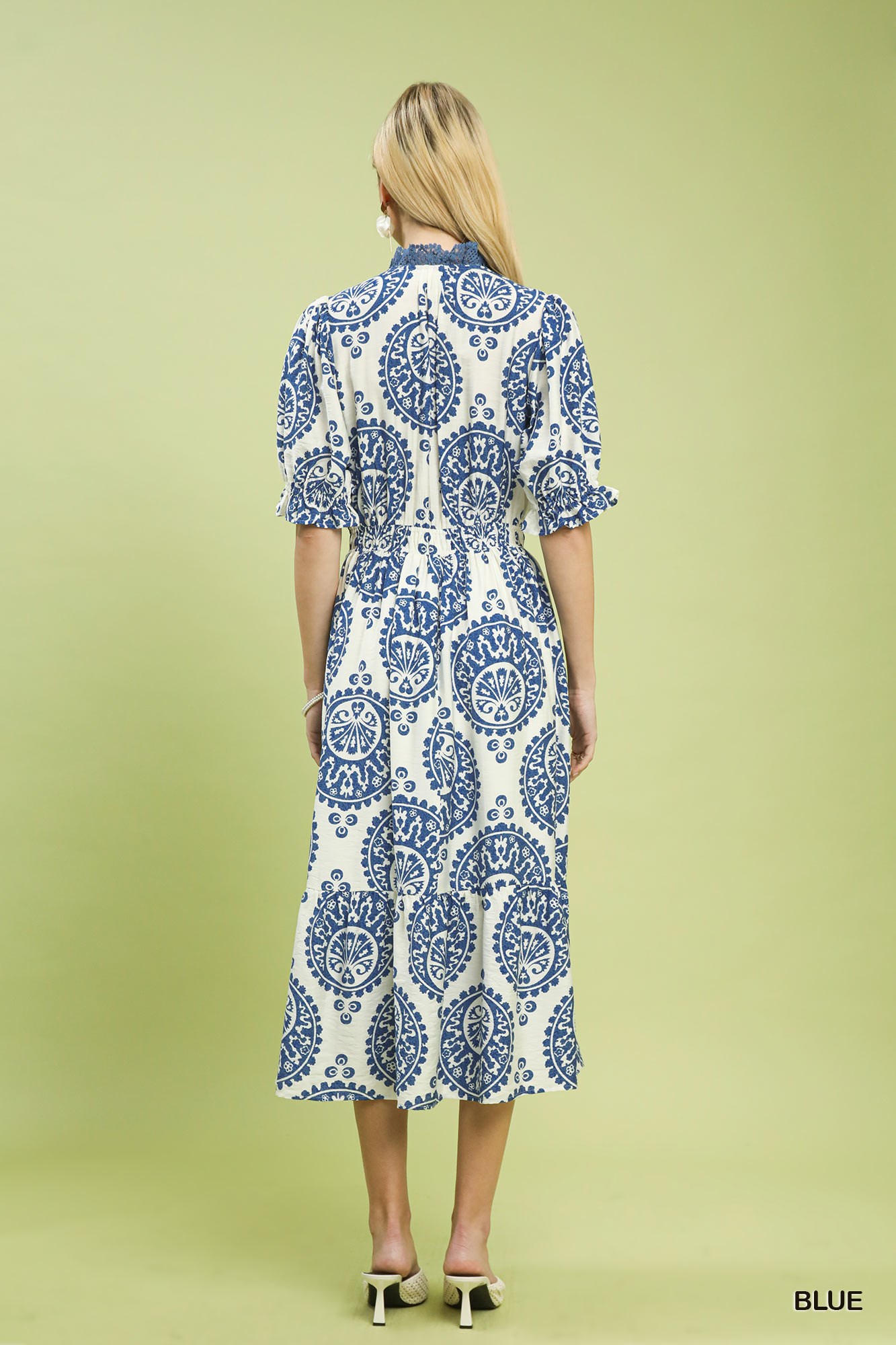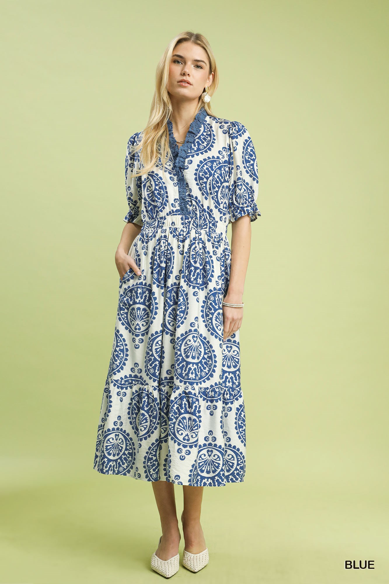 The Paisley Smocked Waist Midi Dress is a chic and versatile piece featuring an allover paisley medallion print for a bohemian touch. This dress is designed with a split V-neck adorned with lace trim detail, adding a delicate and feminine accent. The smocked elastic waist ensures a comfortable and flattering fit, emphasizing the waistline. With a midi length and a skirt lined for coverage, this dress strikes a balance between style and functionality. Elevate your look with this dress that combines intricate lace trim and elegant paisley patterns for a charming and stylish ensemble.