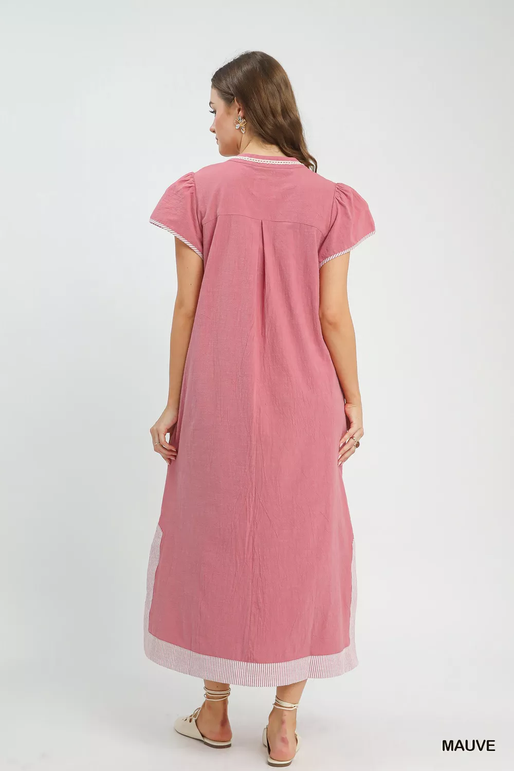 Umgee Embroidered Floral Short Sleeve Midi Dress with Contrast Trim