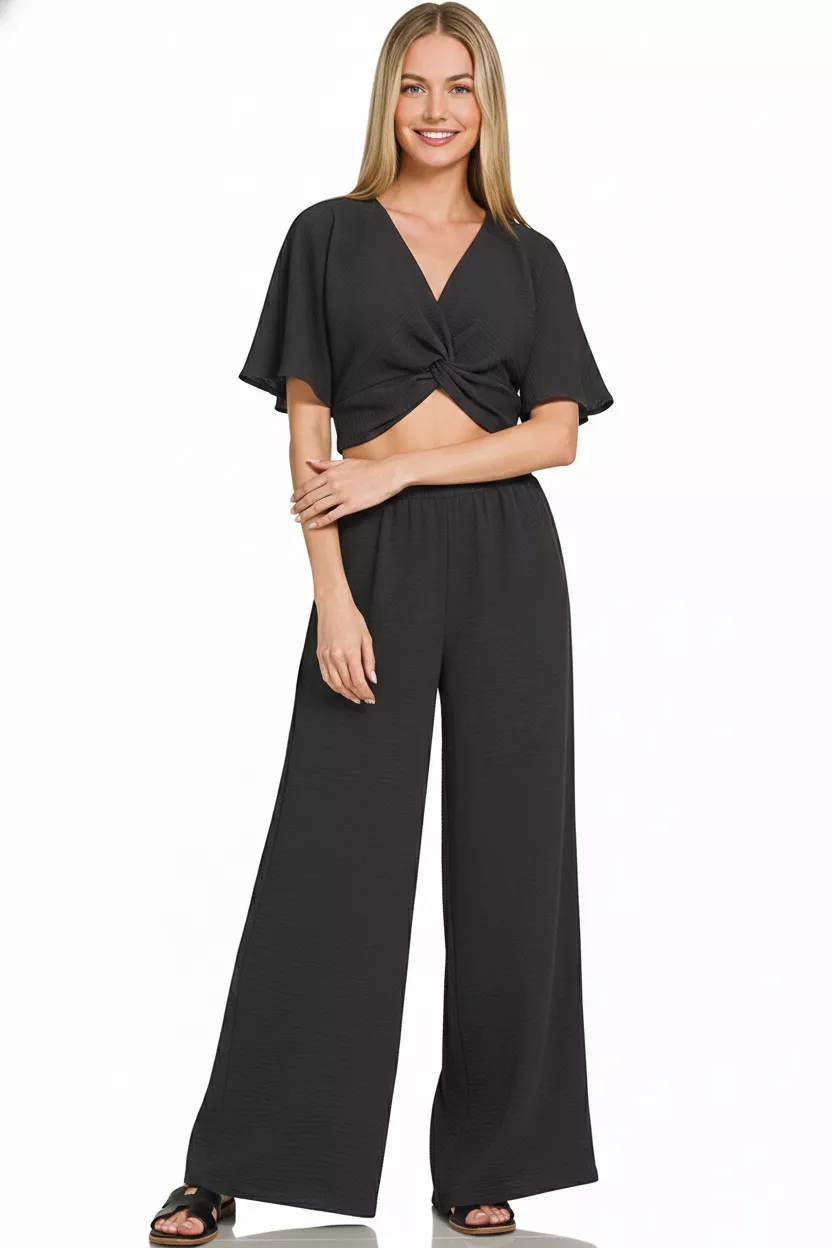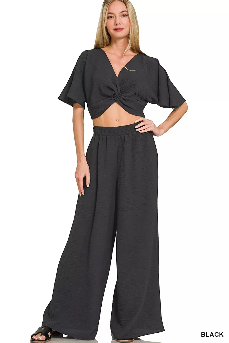 Zenana Woven Airflow Twisted Top & Wide Leg Pants Set
