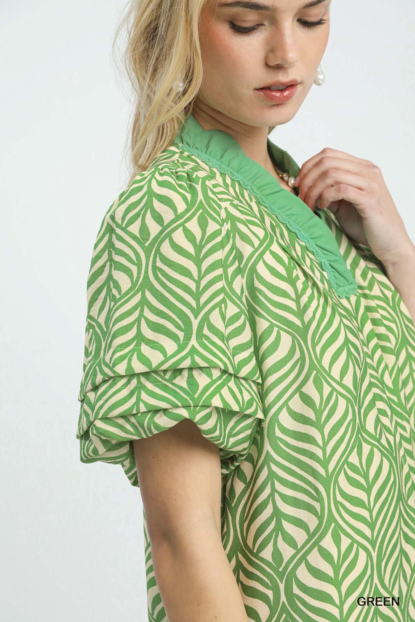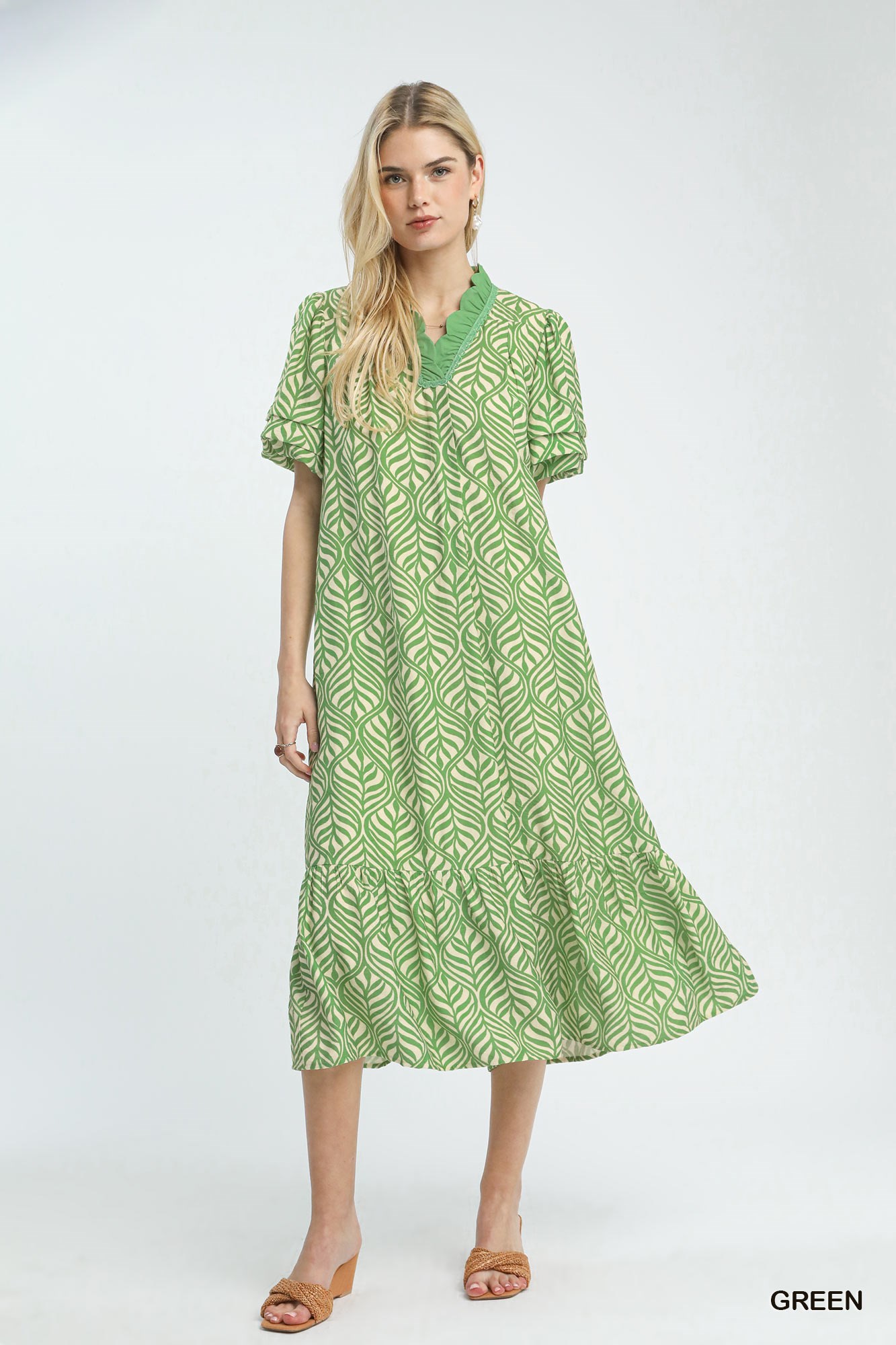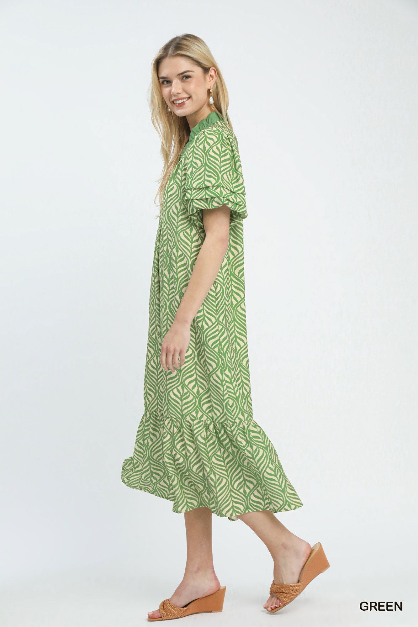 Umgee Leaf Print Ruffle Neck Midi Dress
