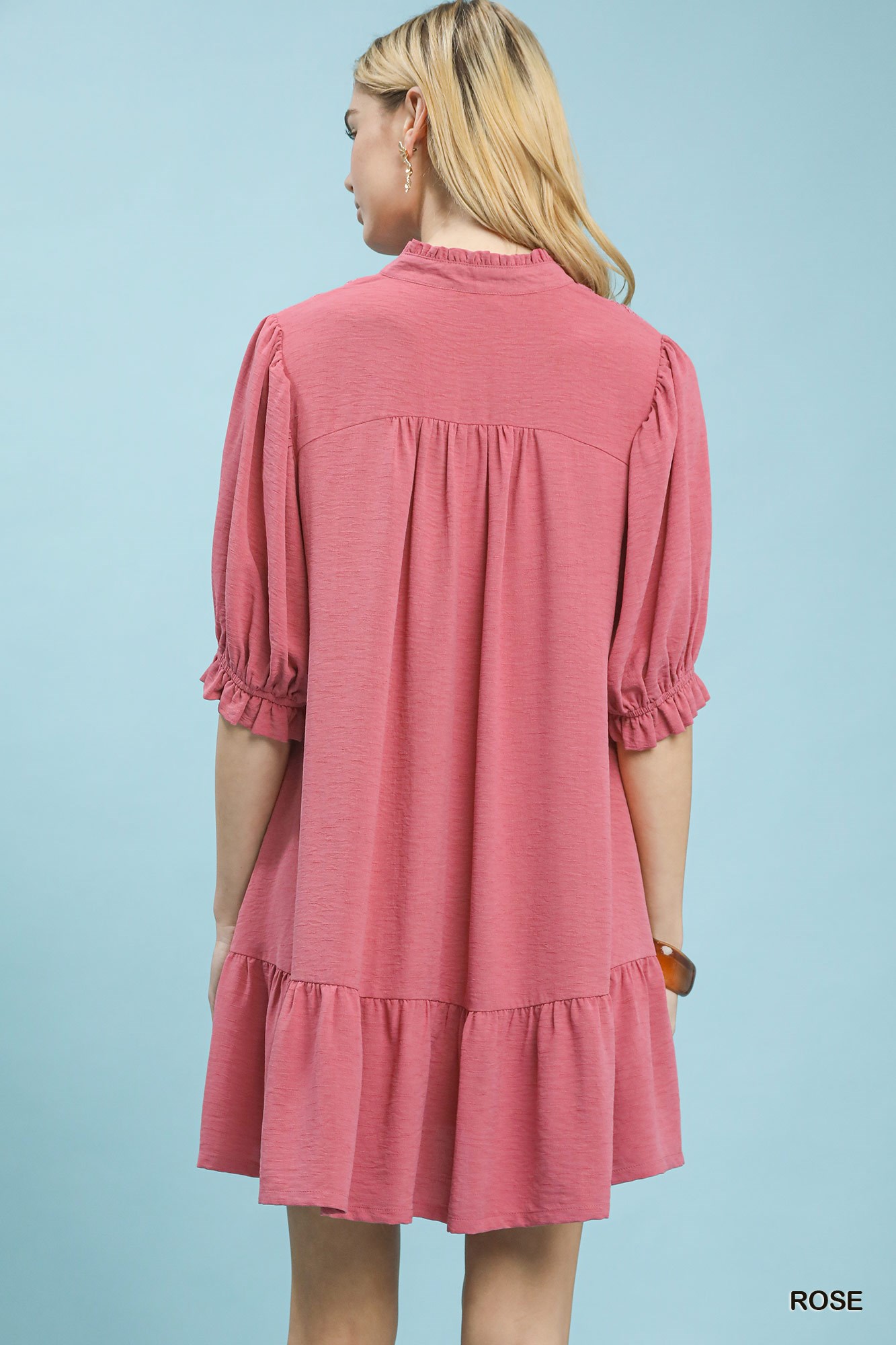 Make a statement in this Lace Yoke Tiered Mini Dress, featuring a split V-neck with a soft stand collar and delicate lace crochet detail for a romantic touch. The 3/4-length sleeves with elastic ruffle cuffs add a feminine flair to the design. With convenient side pockets and a tiered mini length, this dress effortlessly combines style and practicality. Perfect for a day out or special occasion, this dress is not lined for a light and airy feel. Embrace the charming details of this dress for a fresh and elegant look.
