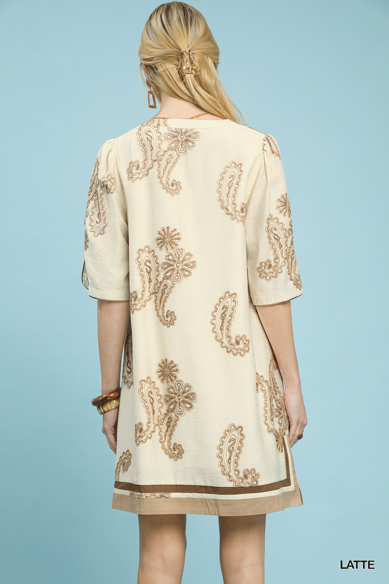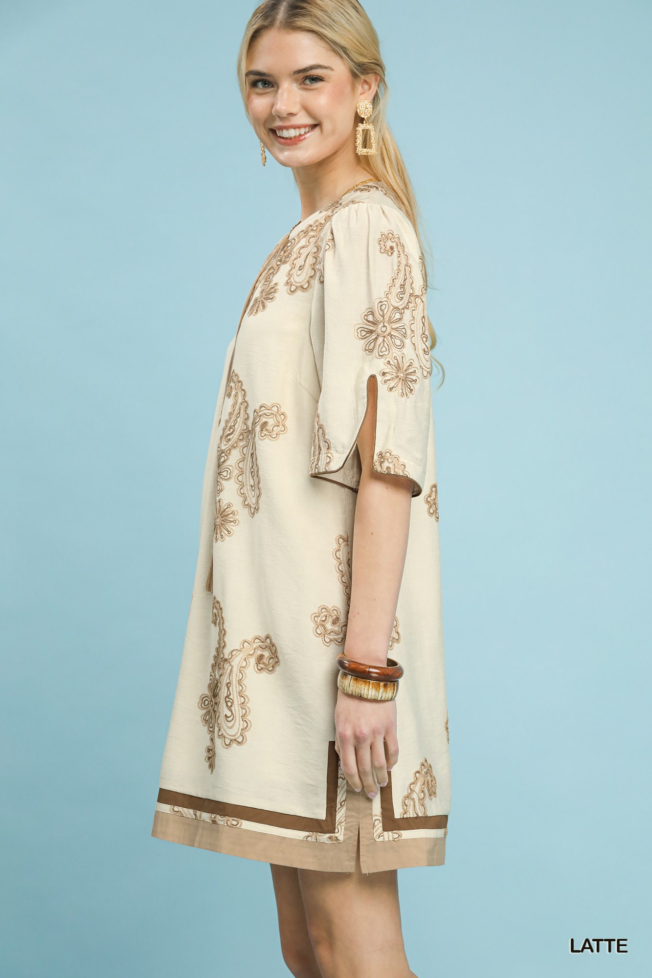 The Embroidered Split Neck Shift Dress is a stunning and versatile piece featuring intricate embroidery throughout. The split V-neck with tassel tie detail adds a bohemian flair to the design, while the contrast trim provides a bold and eye-catching element. This mini dress is perfect for a chic and effortless look, ideal for both casual outings and special occasions. Please note that this dress is not lined, offering a lightweight and comfortable feel for warmer weather. Elevate your style with this stylish dress that combines elegant embroidery with unique detailing for a standout ensemble.