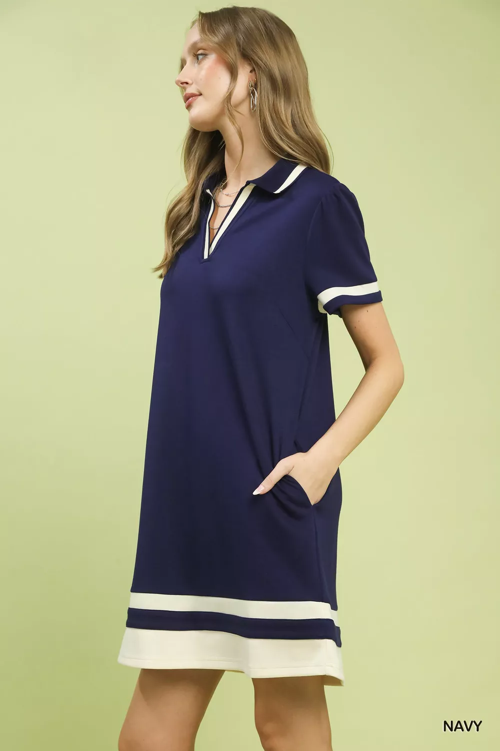 Elevate your casual style with this Luxe Knit Contrast Trim Shift Dress, featuring a split V-neck with striking contrast trim for a modern look. The short sleeves with contrasting cuff detail add a touch of sophistication to this relaxed silhouette. Convenient side pockets offer both style and functionality, perfect for storing essentials on the go. Embrace the chic colorblock design that adds a dynamic element to this versatile dress. Please note that this dress is not lined, making it a breathable and lightweight option for everyday wear.