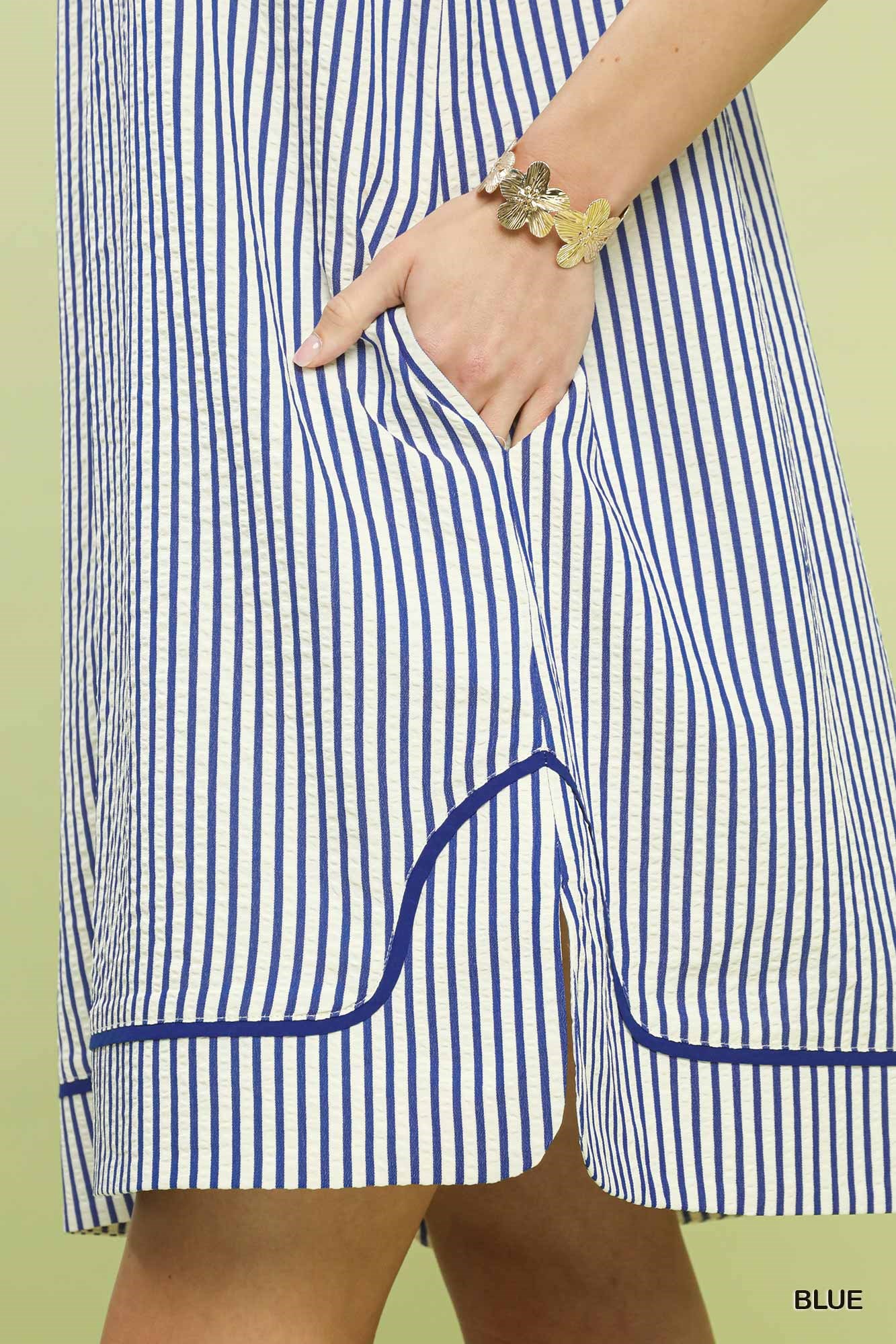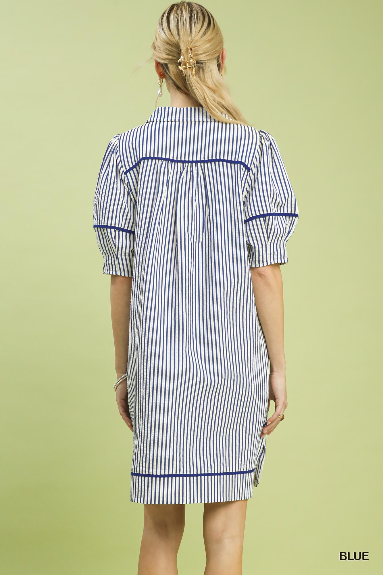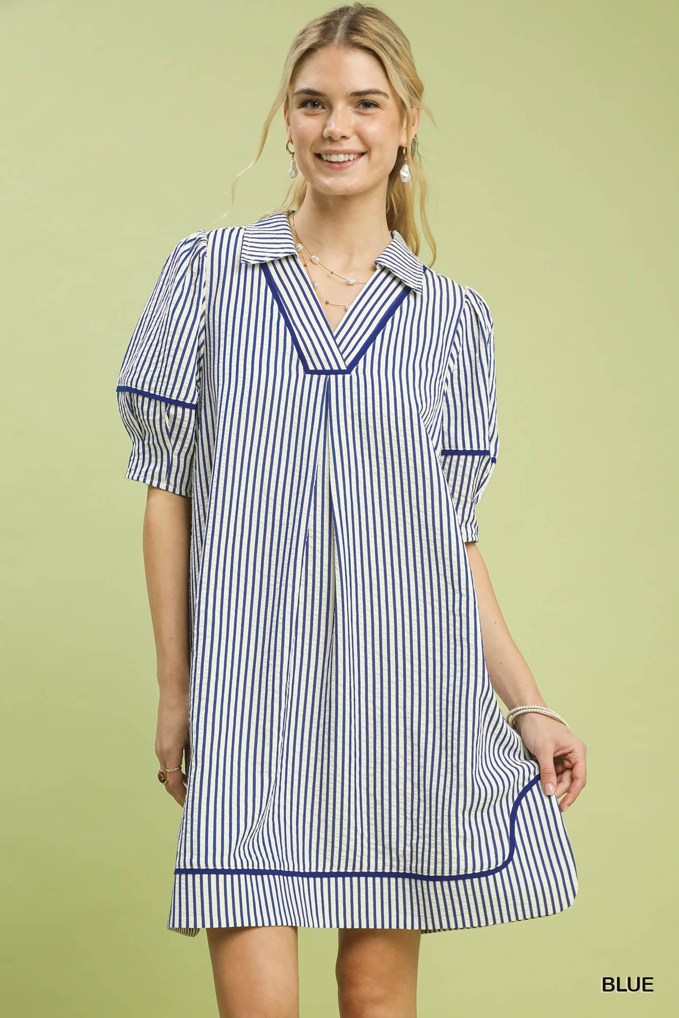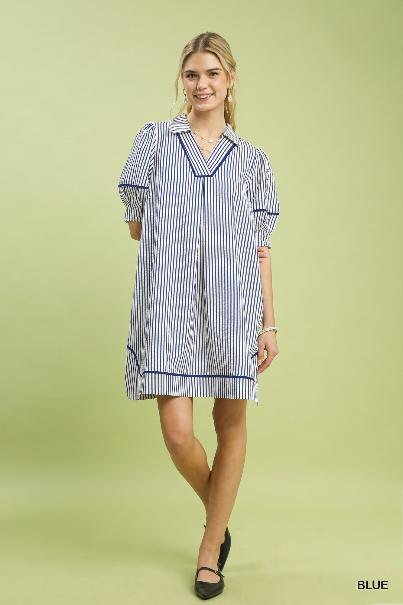 This stylish shift dress features a split V-neck with a chic collar and elbow-length sleeves for a sophisticated look. The contrasting trim and vertical stripe design offer a modern twist to this classic silhouette. Piping details add a touch of elegance, while the side pockets provide functionality. Perfect for both casual and formal occasions, this dress is a versatile addition to any wardrobe. Please note that it is not lined for a lightweight and breathable feel.