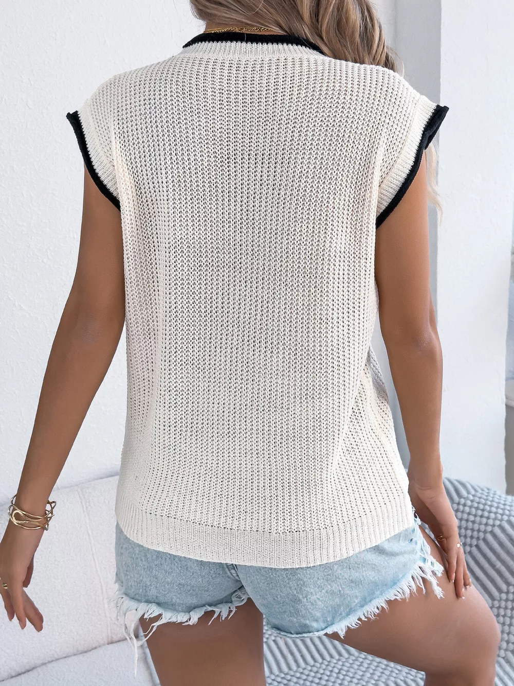 Contrast Trim Round Neck Cap Sleeve Sweater
