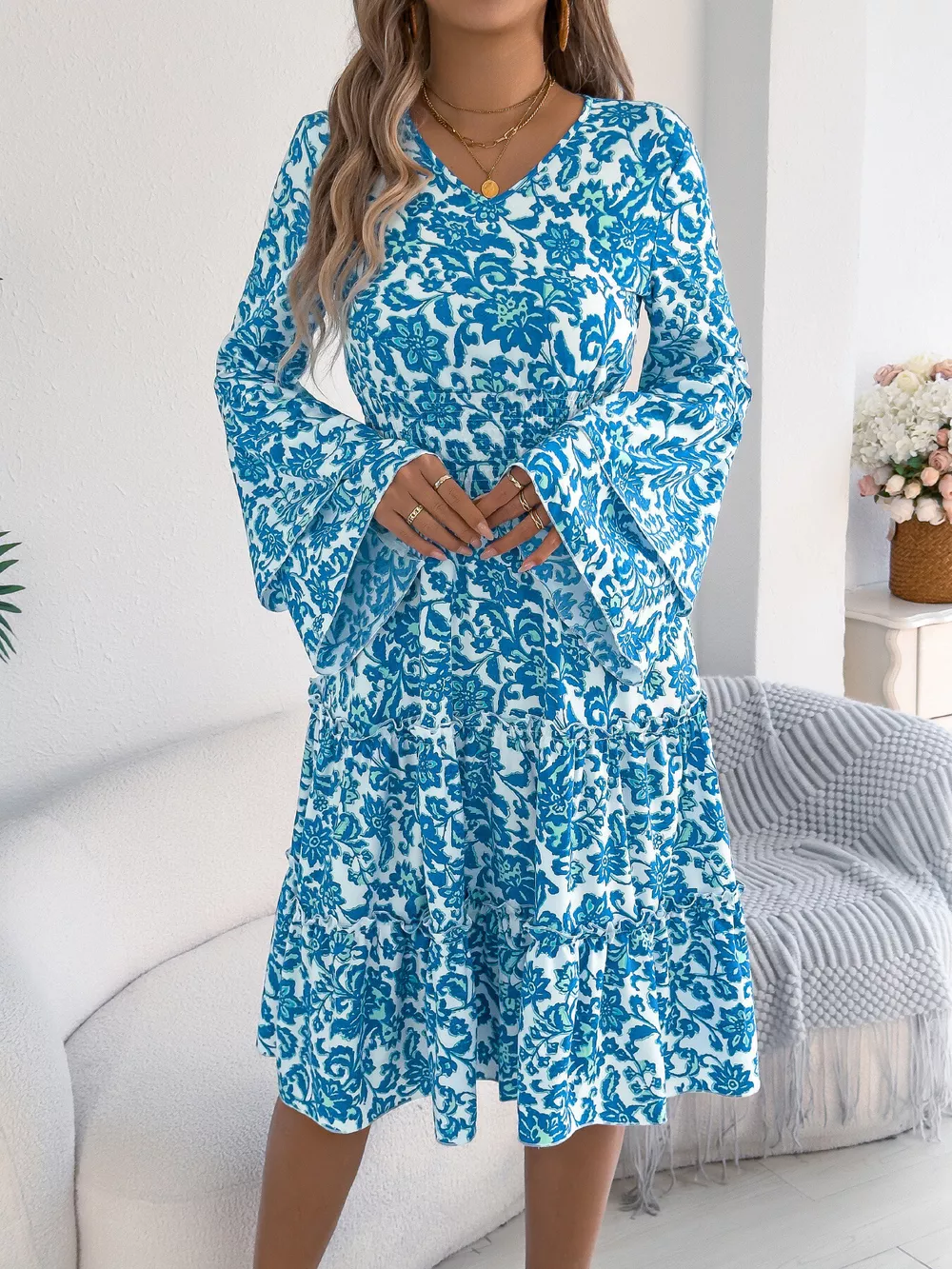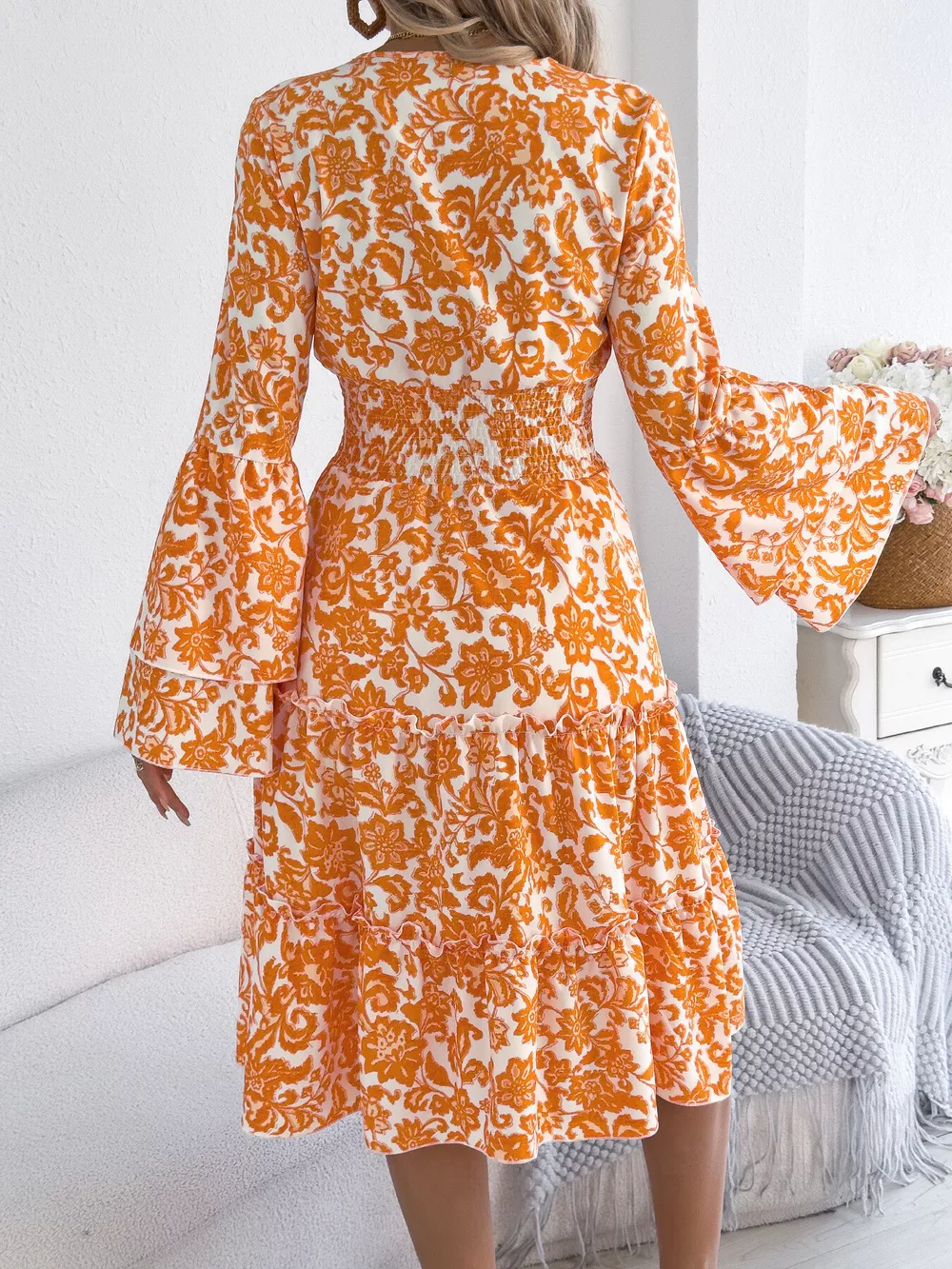 Floral Print Smocked Ruffle Hem Flared Sleeve Dress