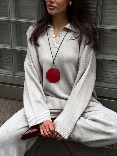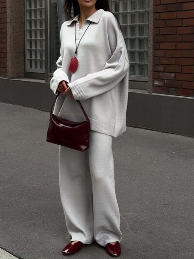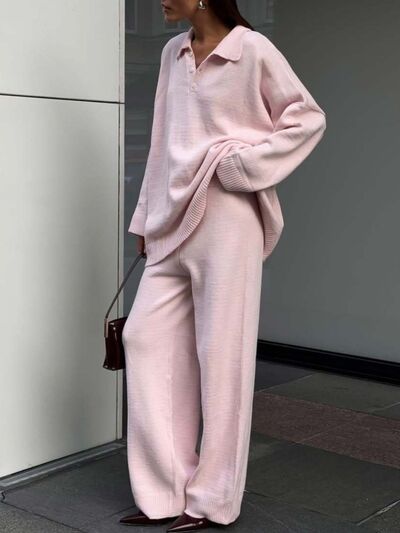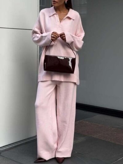 Polo Collar Top and Wide Leg Pants Knit Set
