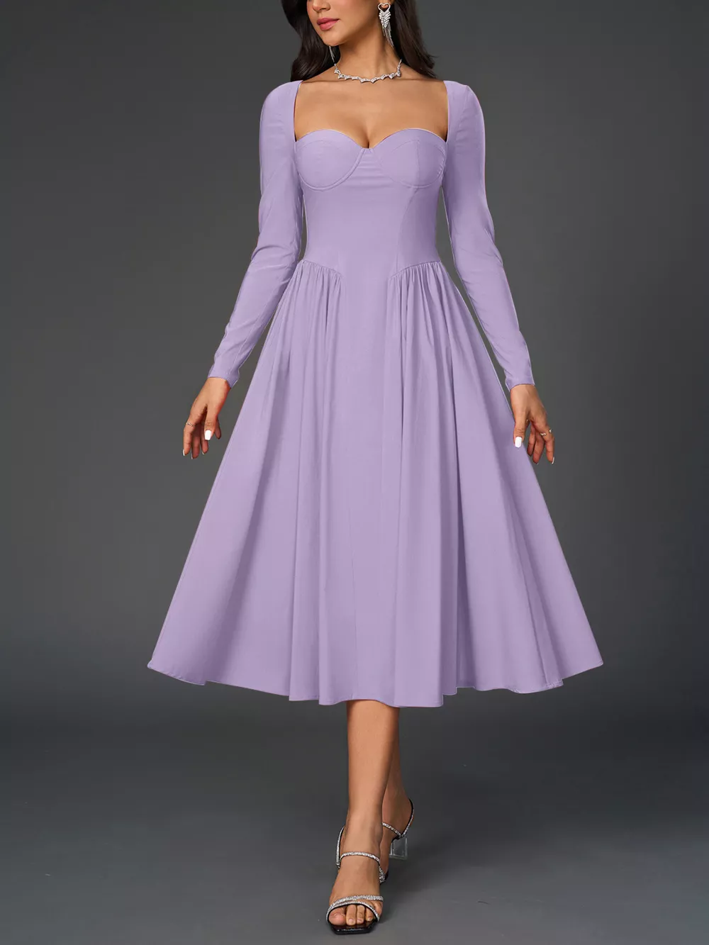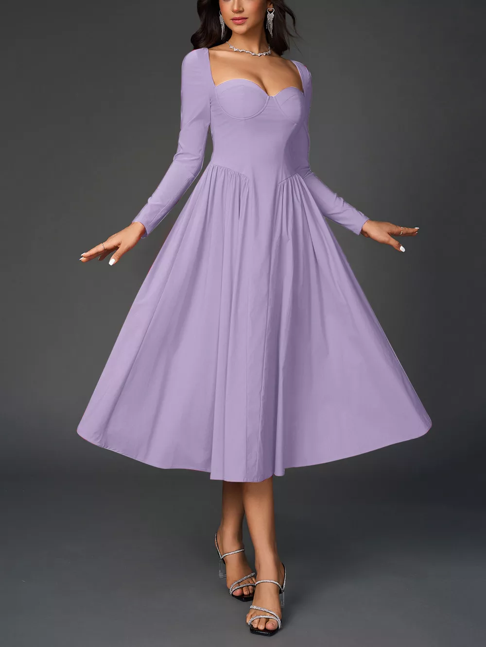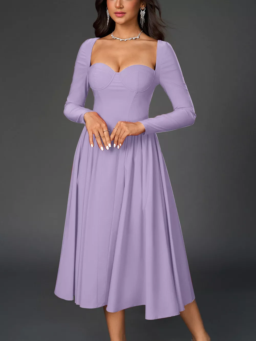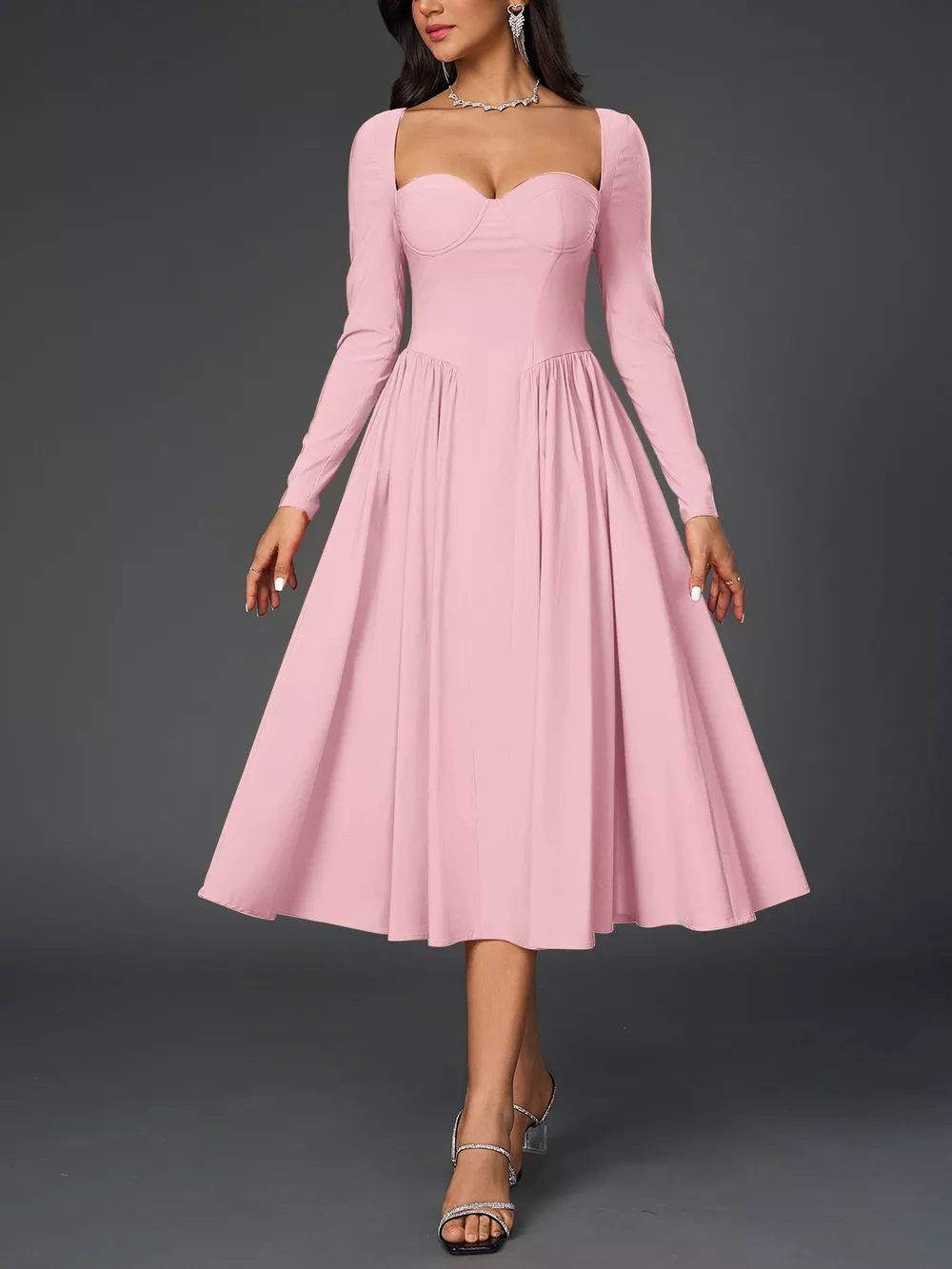 Sweetheart Neckline Long Sleeve A-Line Midi Dress