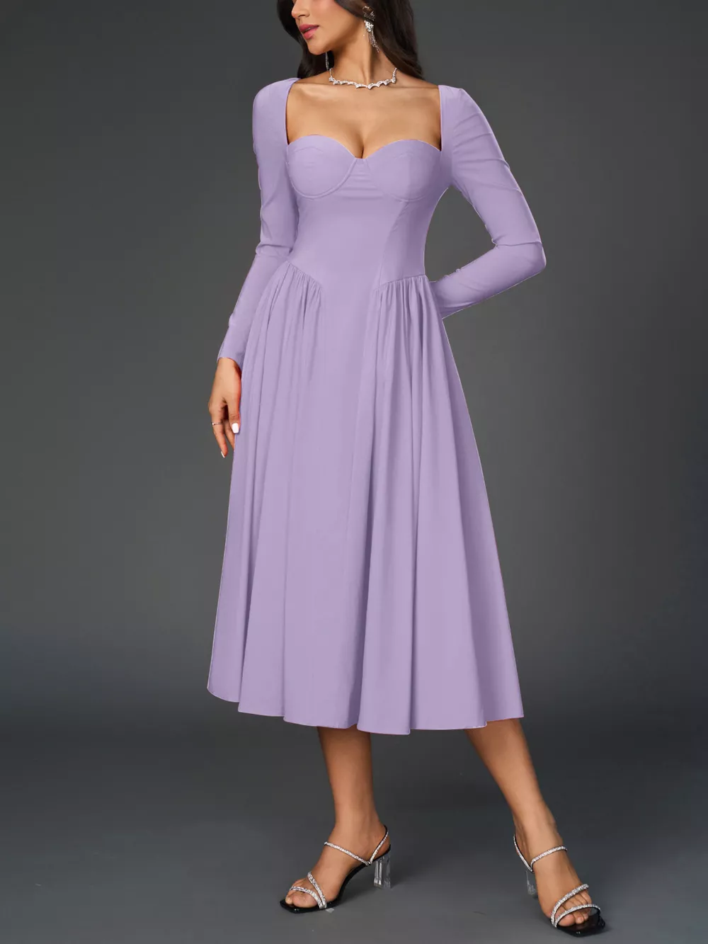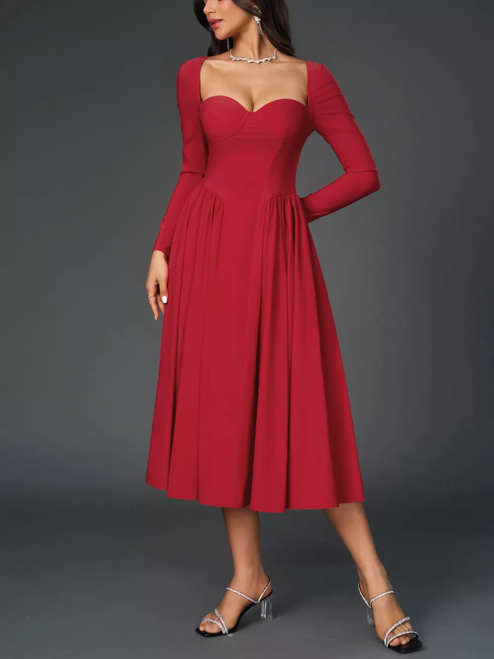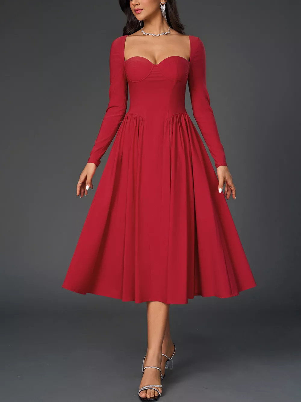 Sweetheart Neckline Long Sleeve A-Line Midi Dress