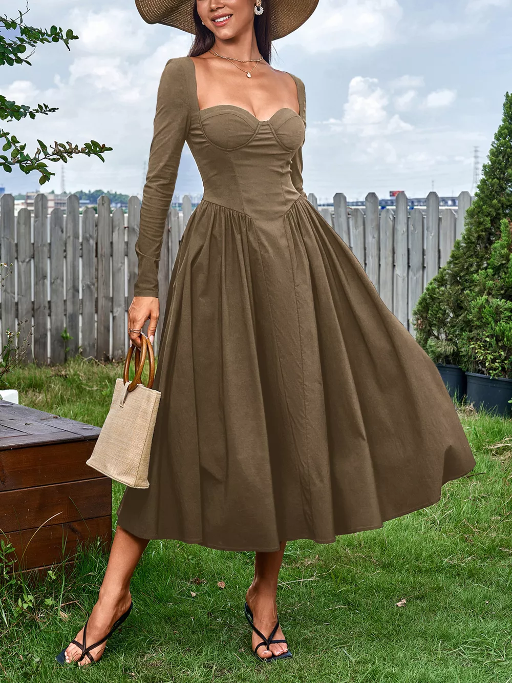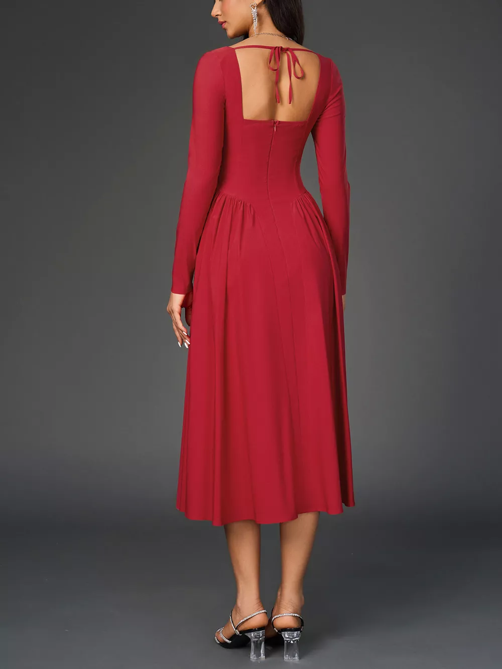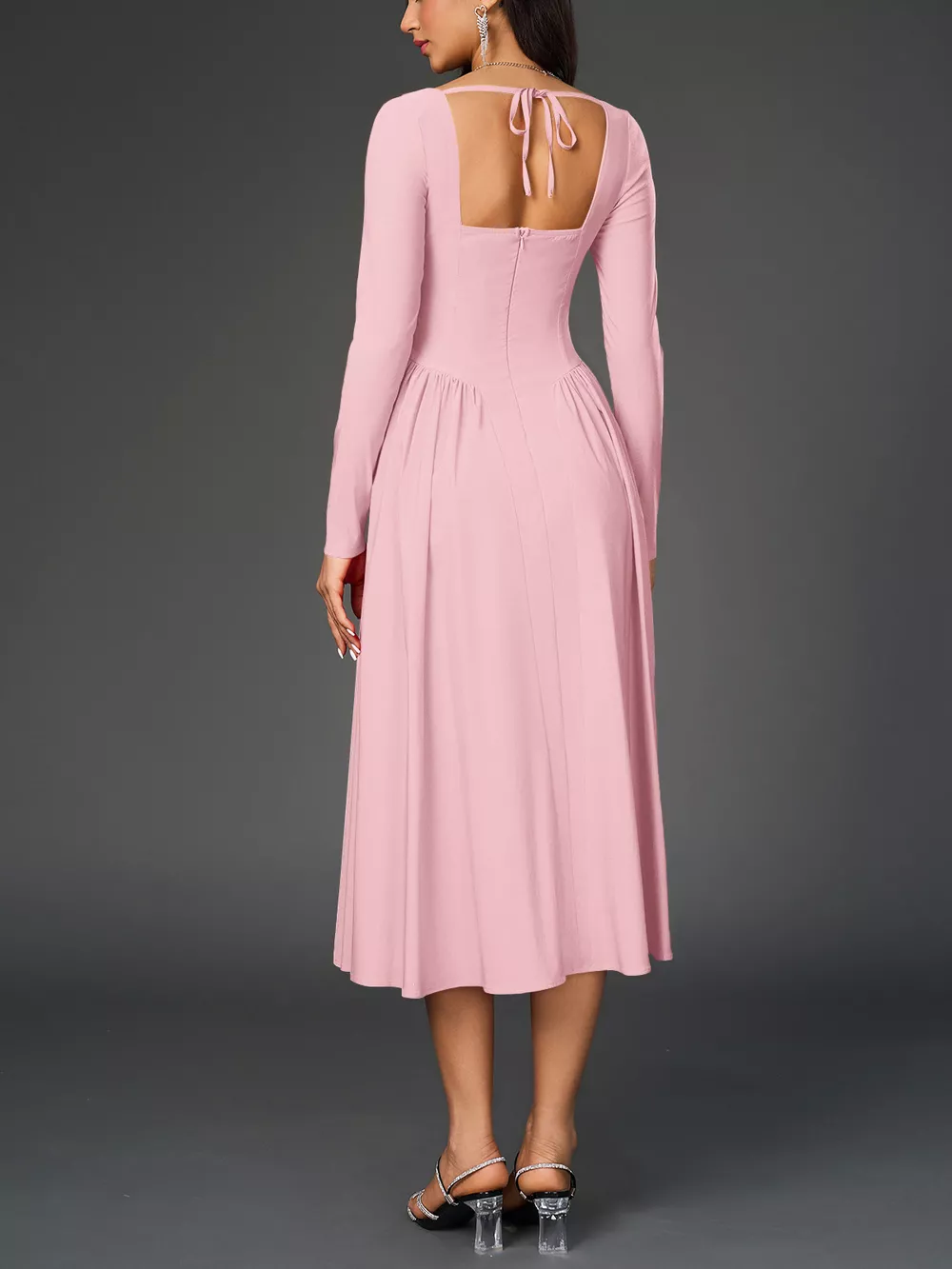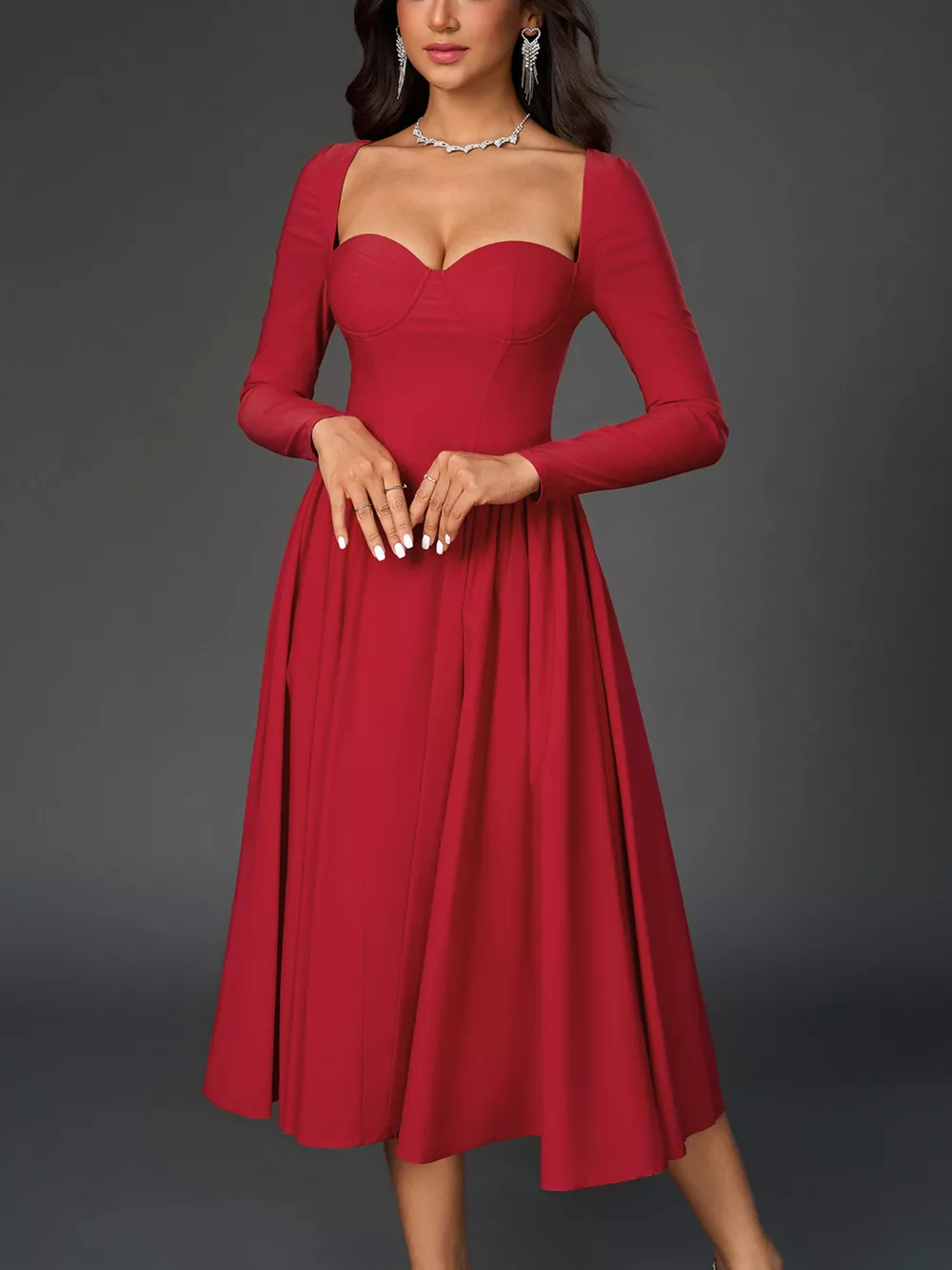 Sweetheart Neckline Long Sleeve A-Line Midi Dress