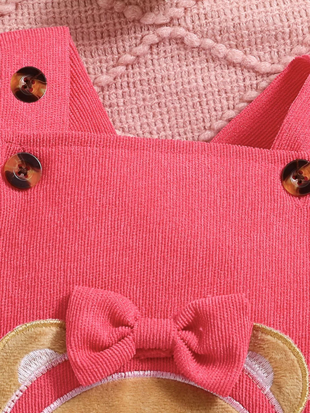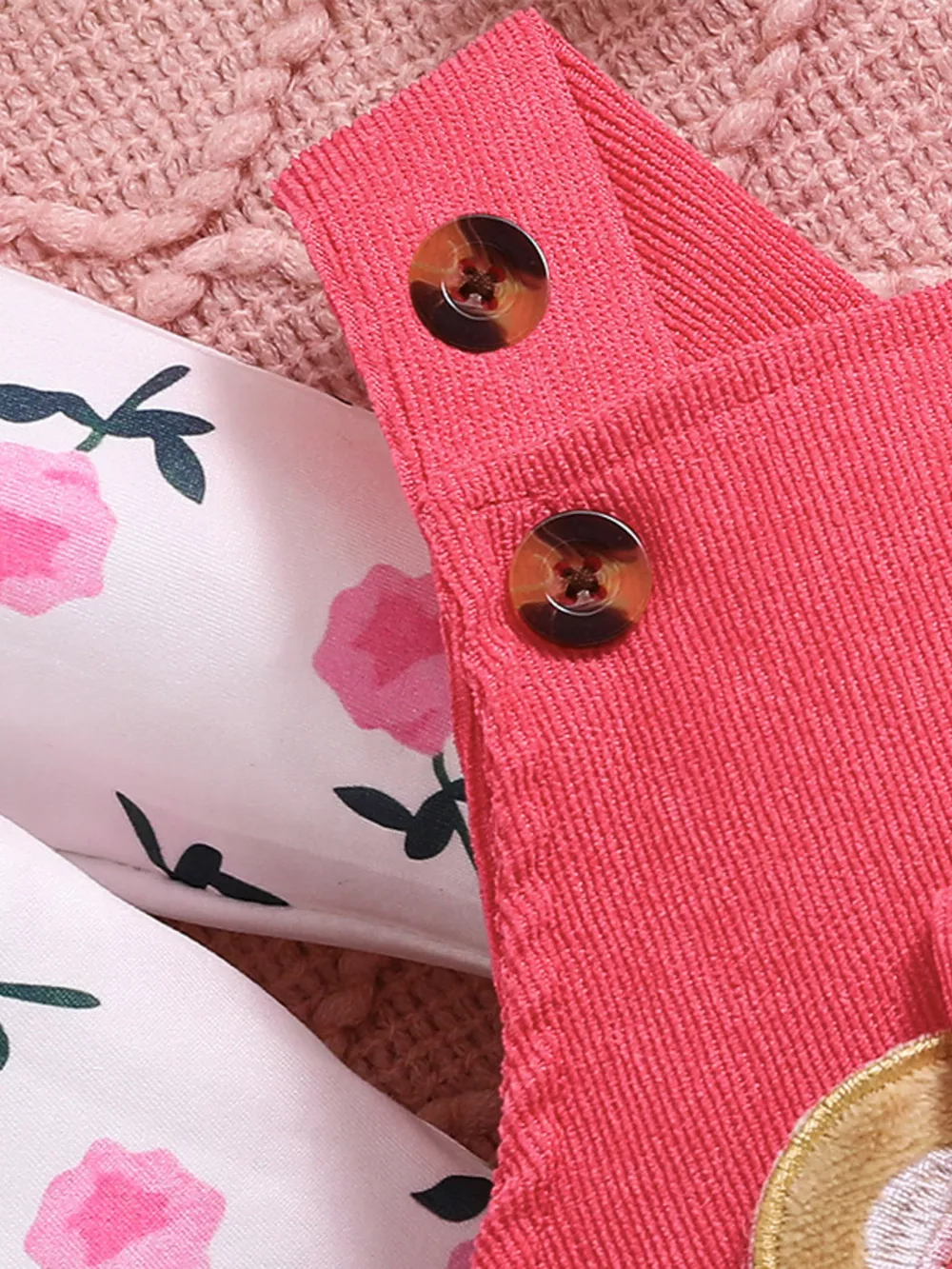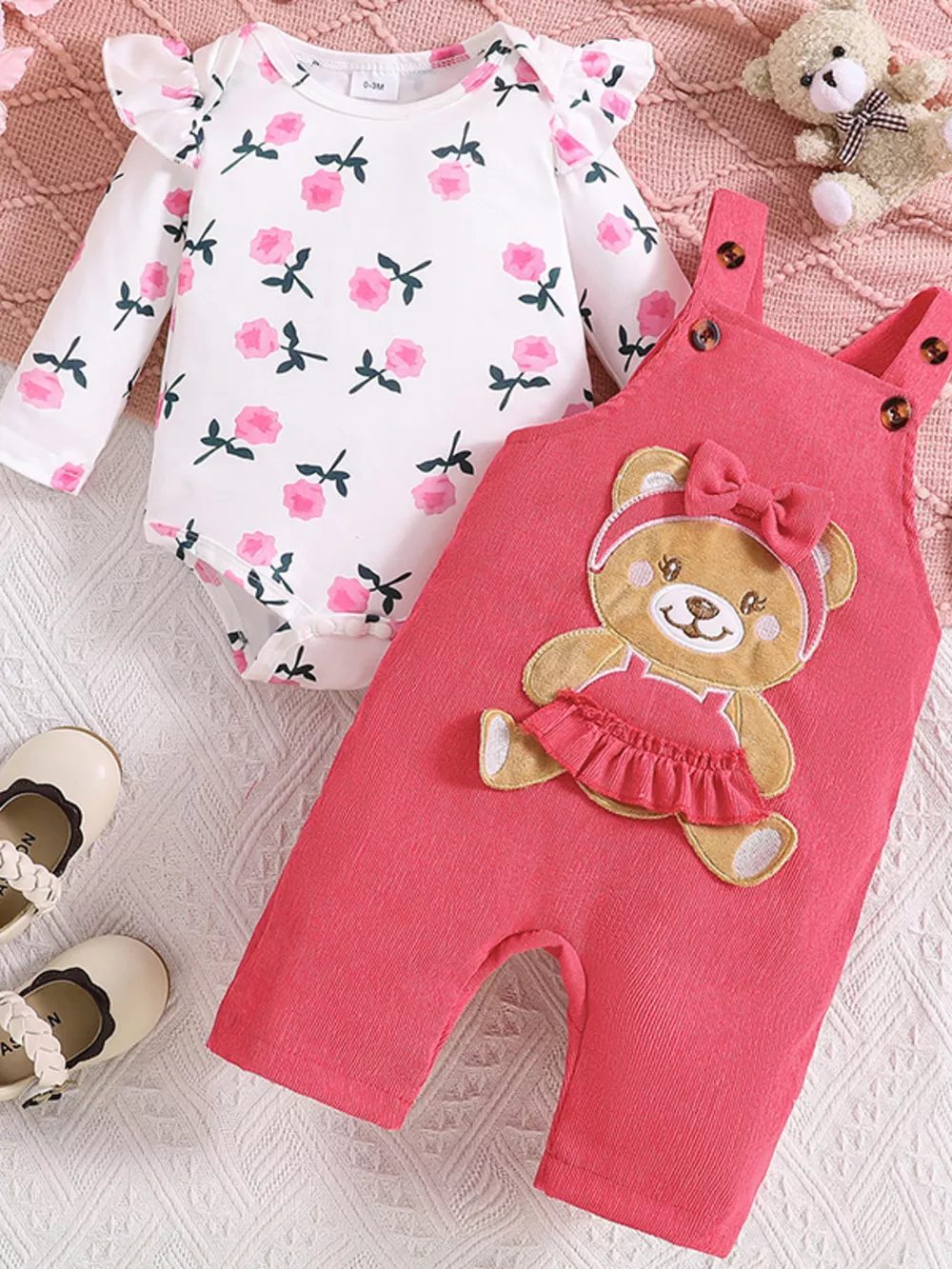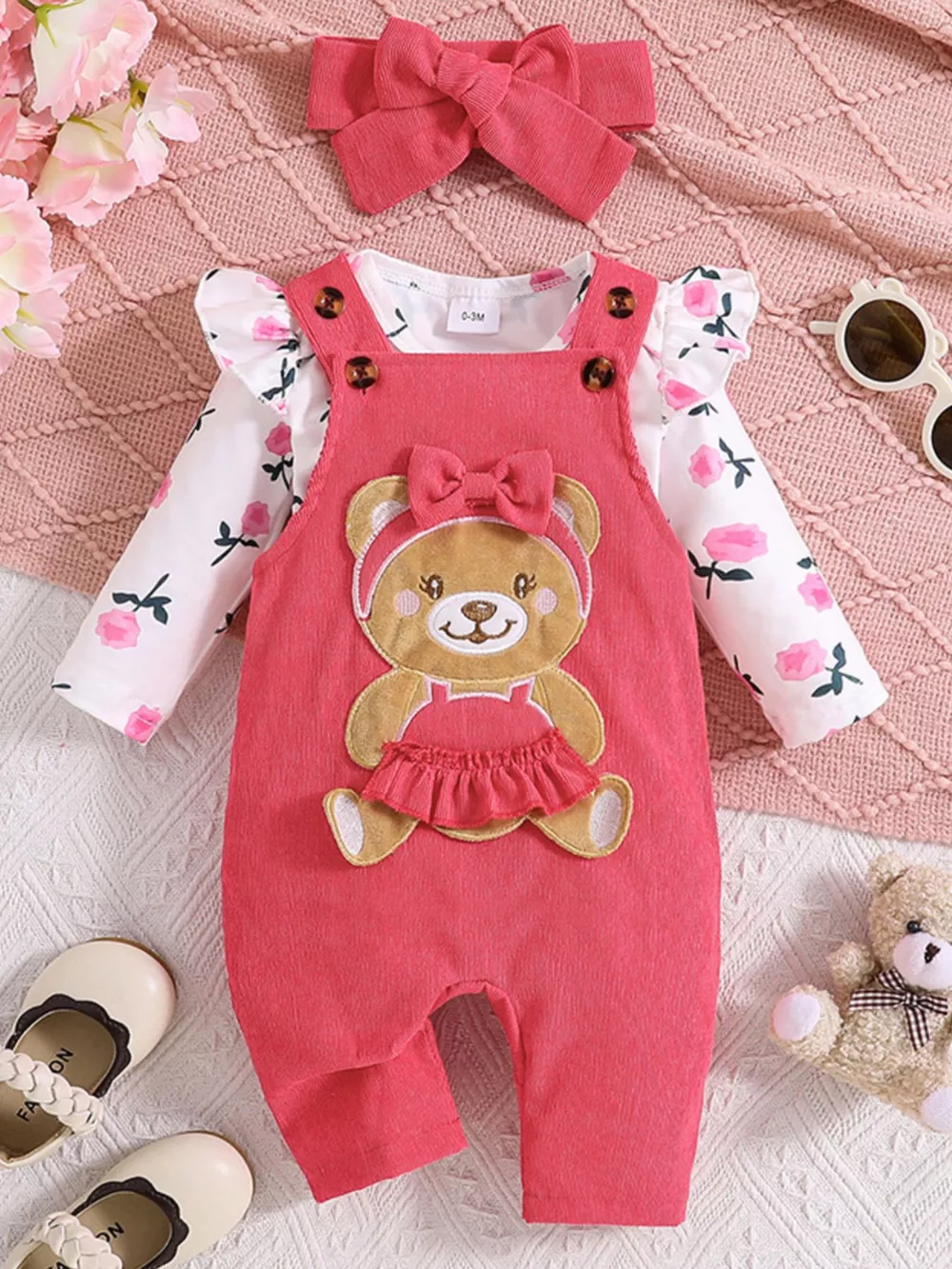 Children's Floral Bodysuit and Bear Overalls Set with Headband