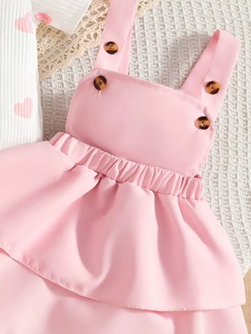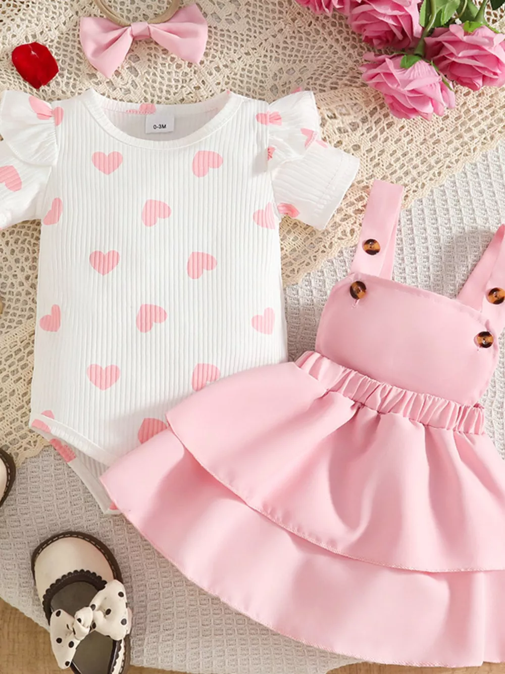 Children's Heart Print Ruffle Trim Bodysuit and Dress Set with Headband