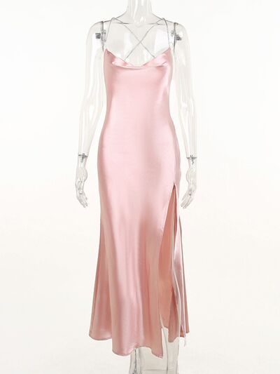 Slinky Satin Cowl Neck High Slit Dress with Back Lace Up