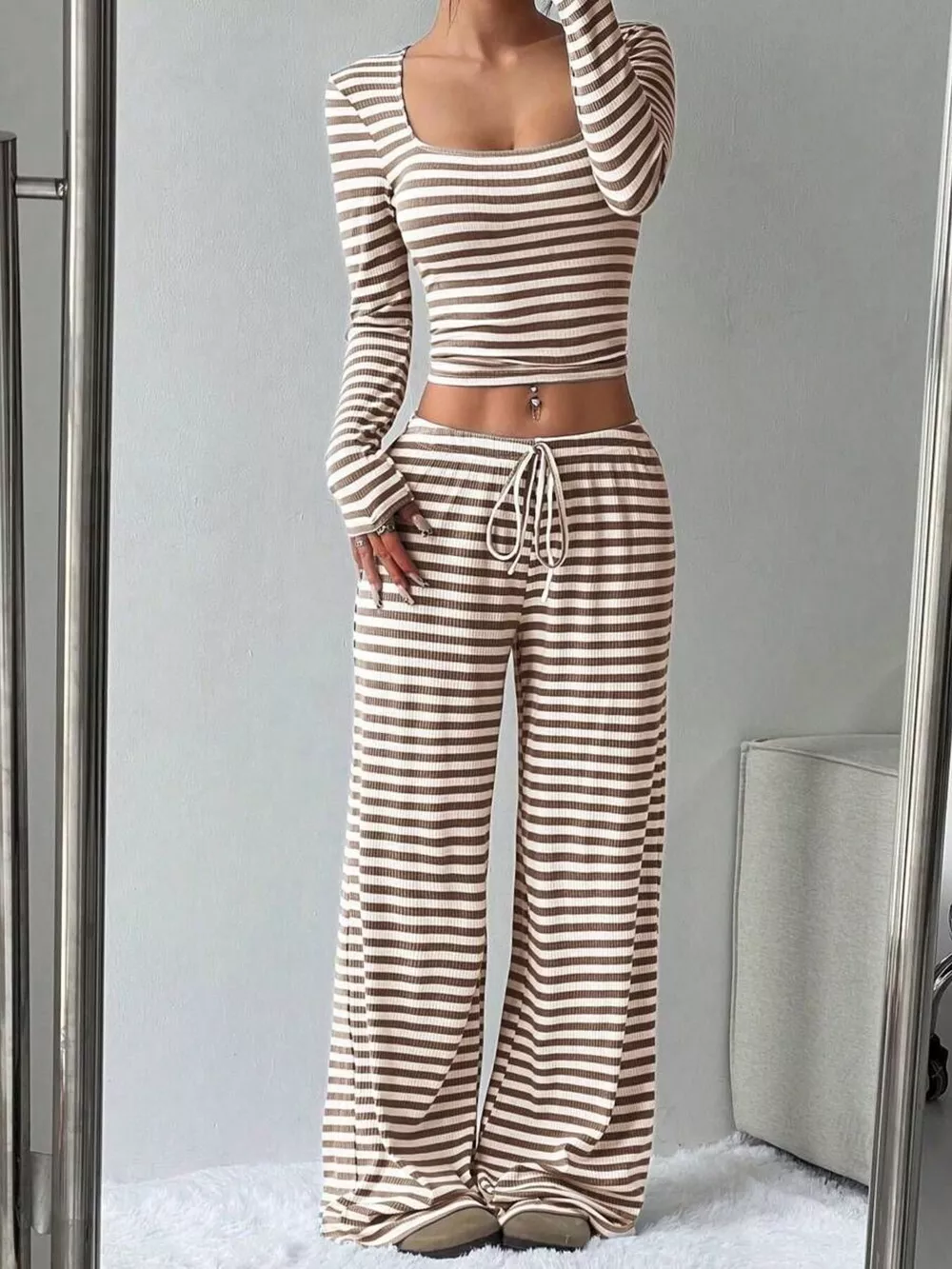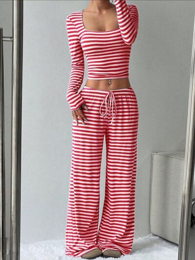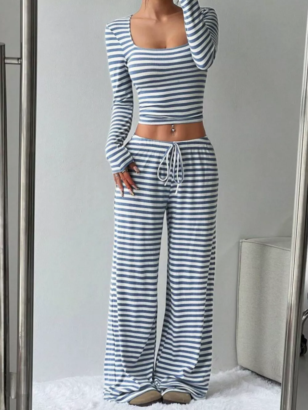 Striped Long Sleeve Crop Top & Wide Leg Pants Set