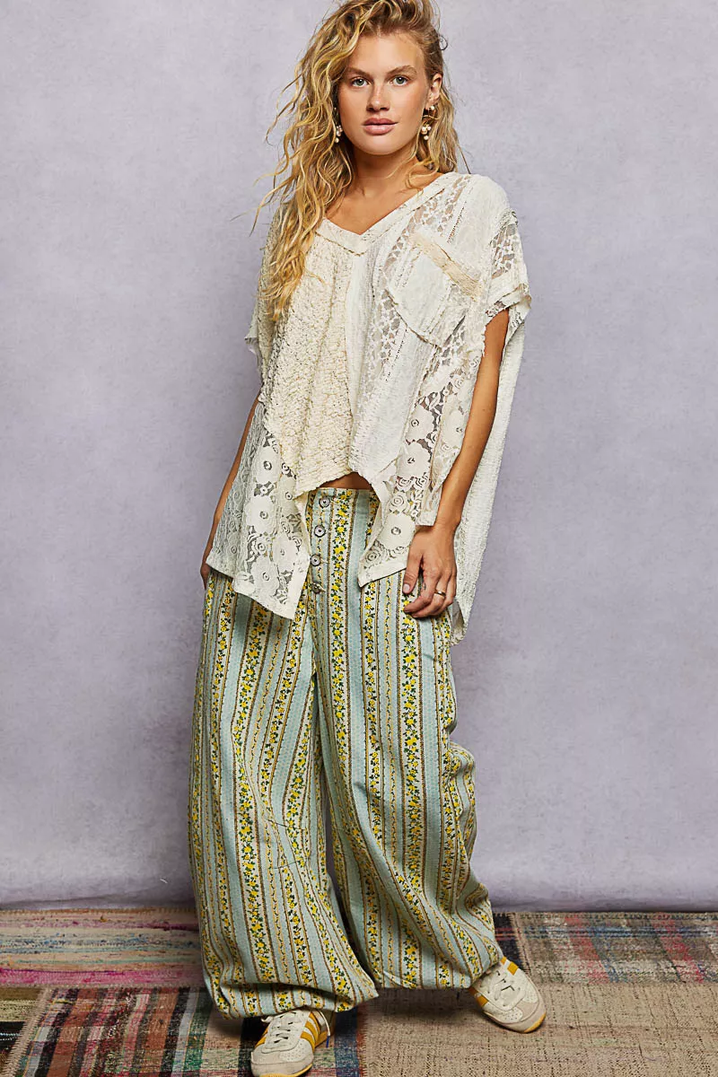 The V-neck sleeveless oversized fit top in lace is a chic and on-trend piece that embodies effortless style. Featuring raw edge detailing and a pointed solid pattern, this top offers a unique and modern touch to your look. The sleeveless design adds a touch of sophistication, perfect for warmer weather or layered with a jacket. Embrace the oversized fit for a relaxed yet stylish silhouette that can be dressed up or down. Elevate your wardrobe with this standout lace top that combines comfort and fashion-forward design.