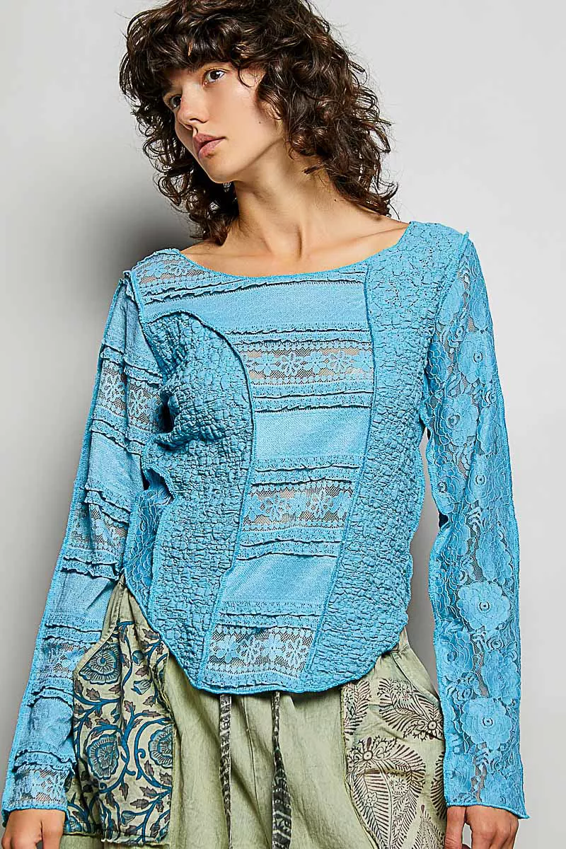 POL Round Neck Long Sleeve Exposed Seam Top with Lace Detail