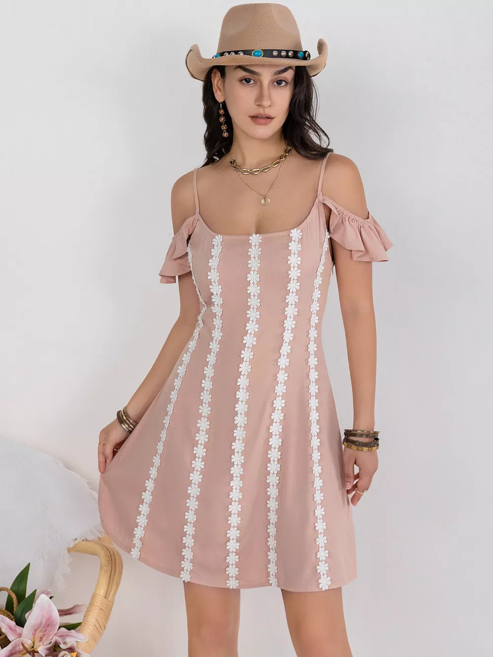 Floral Lace Trim Cold Shoulder A-Line Dress