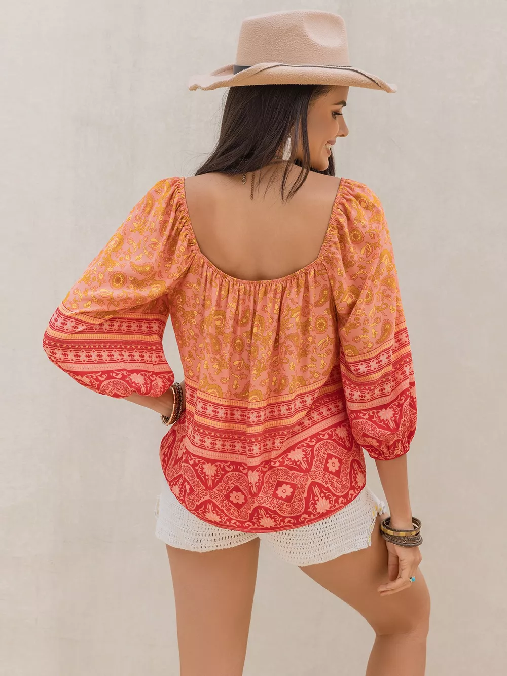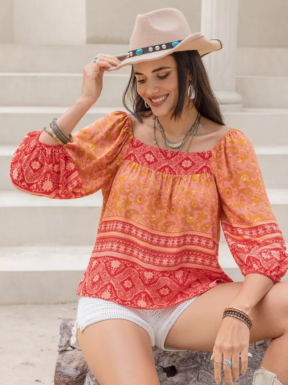 Printed Square Neck Balloon Sleeve Blouse