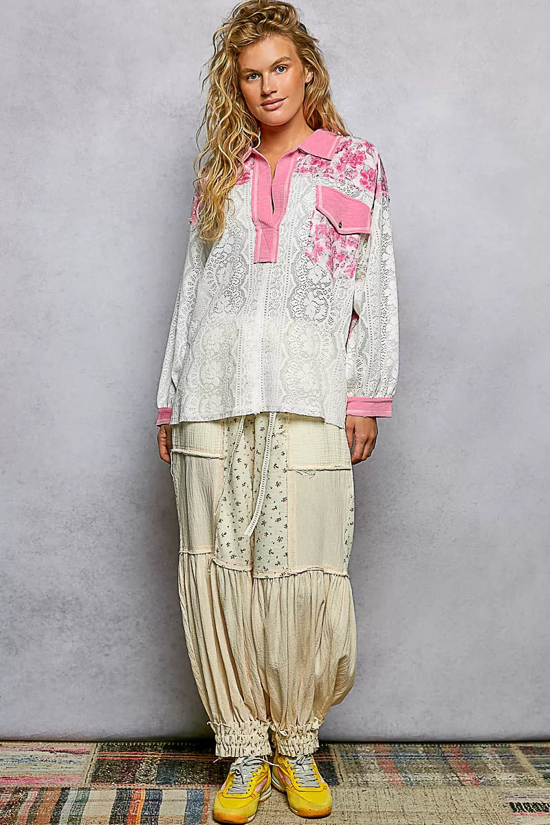 POL Floral Print Long Sleeve Lace Shirt with Front Pocket