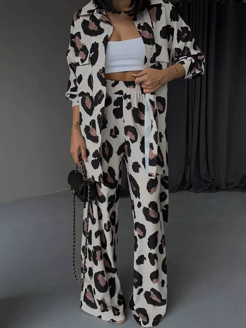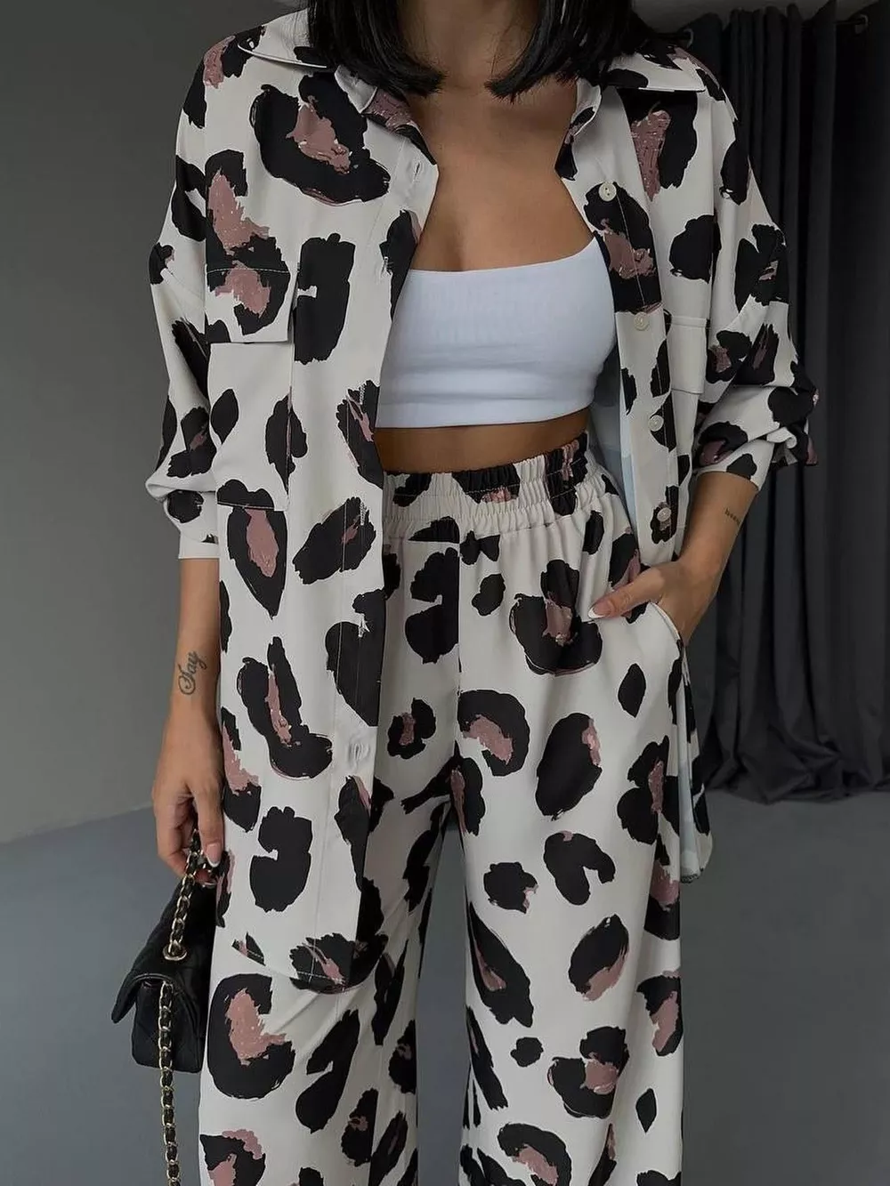 Leopard Print Relaxed Fit Shirt and Pants Two-Piece Set