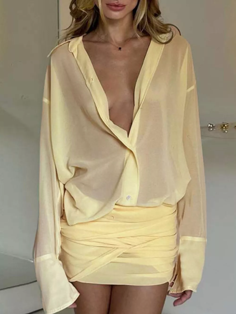 • Features:Buttoned,Sheer,Ruched,Tied