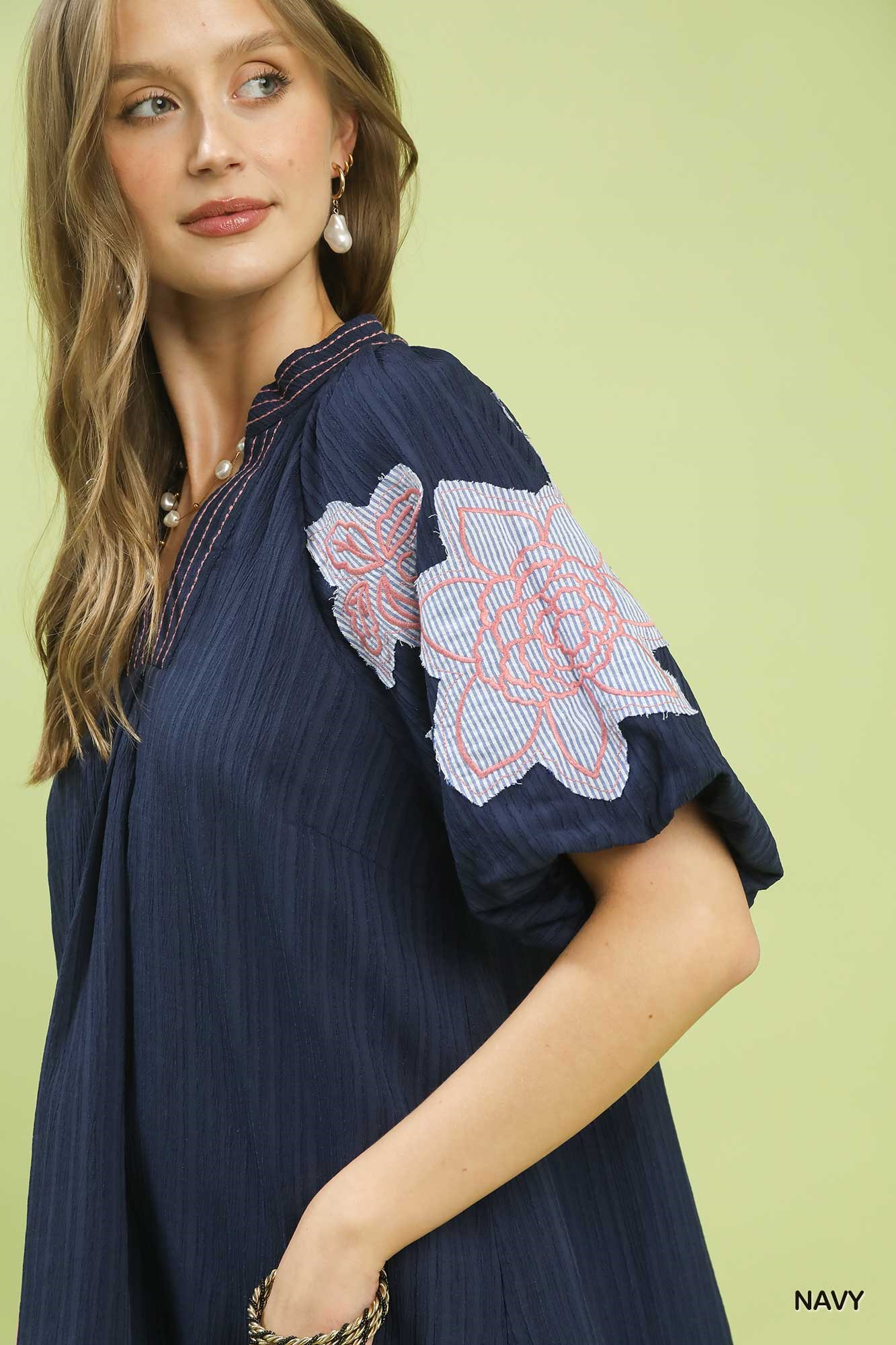 Umgee Embroidered Balloon Sleeve Notch Neck Blouse