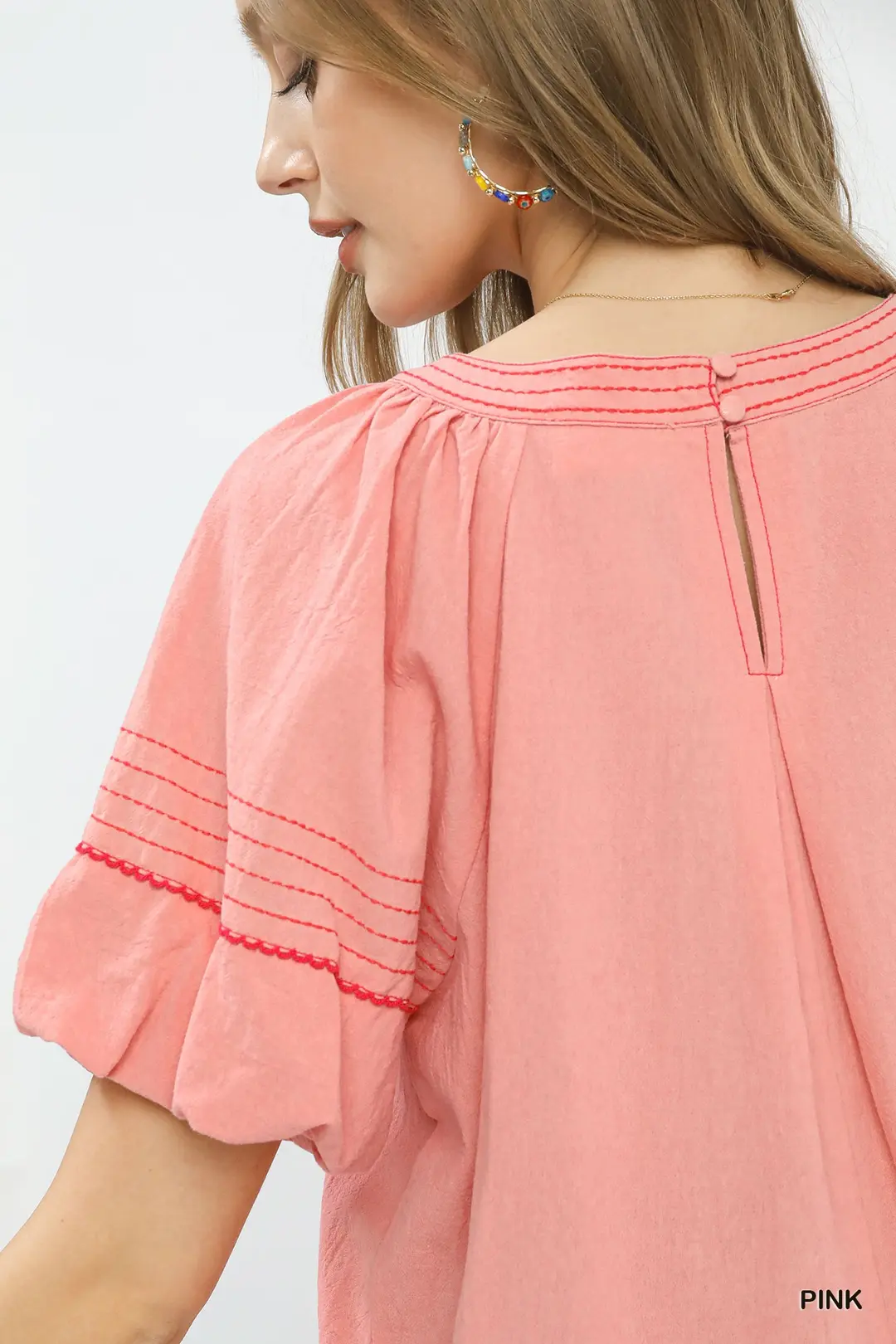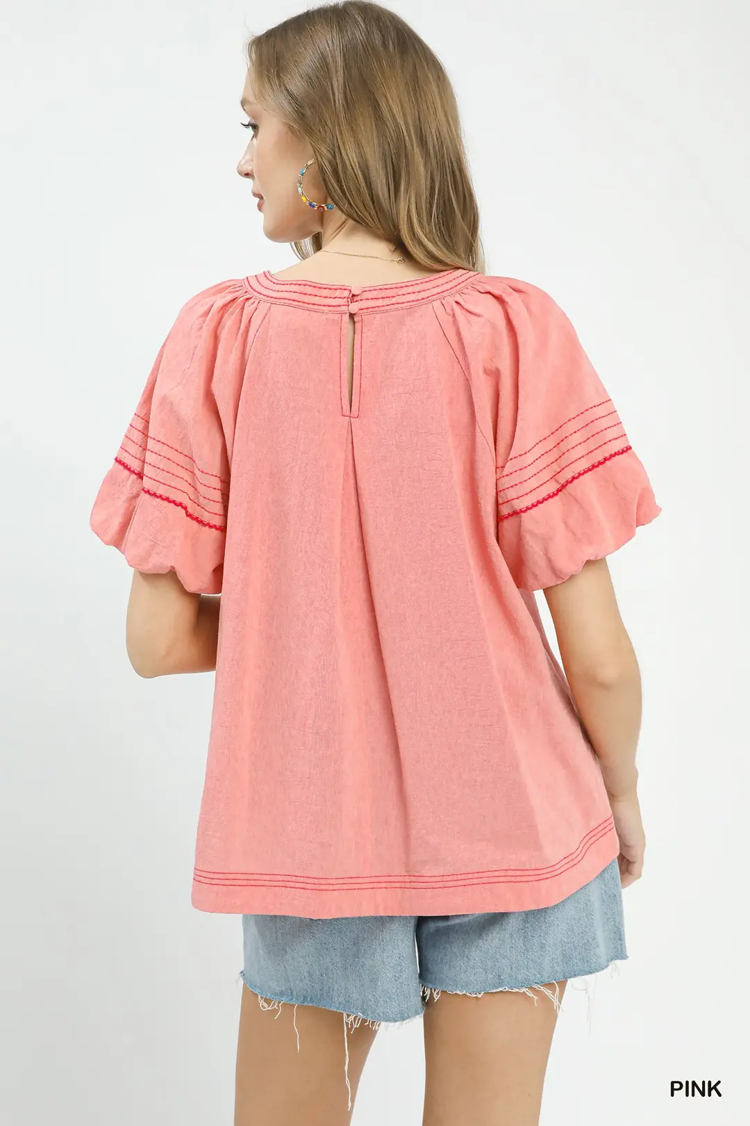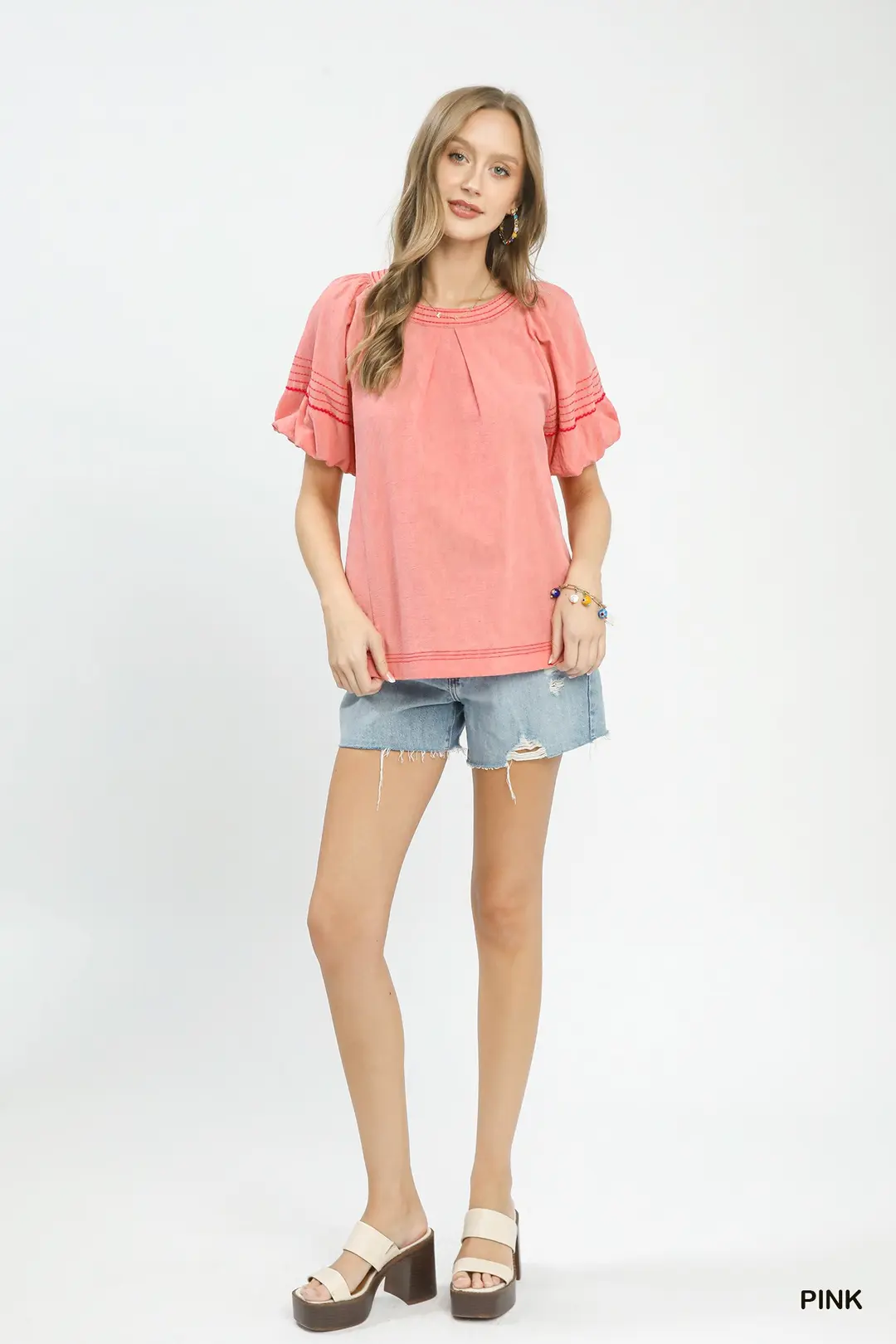 Umgee Round Neck Puff Sleeve Top with Contrast Stitch Detail