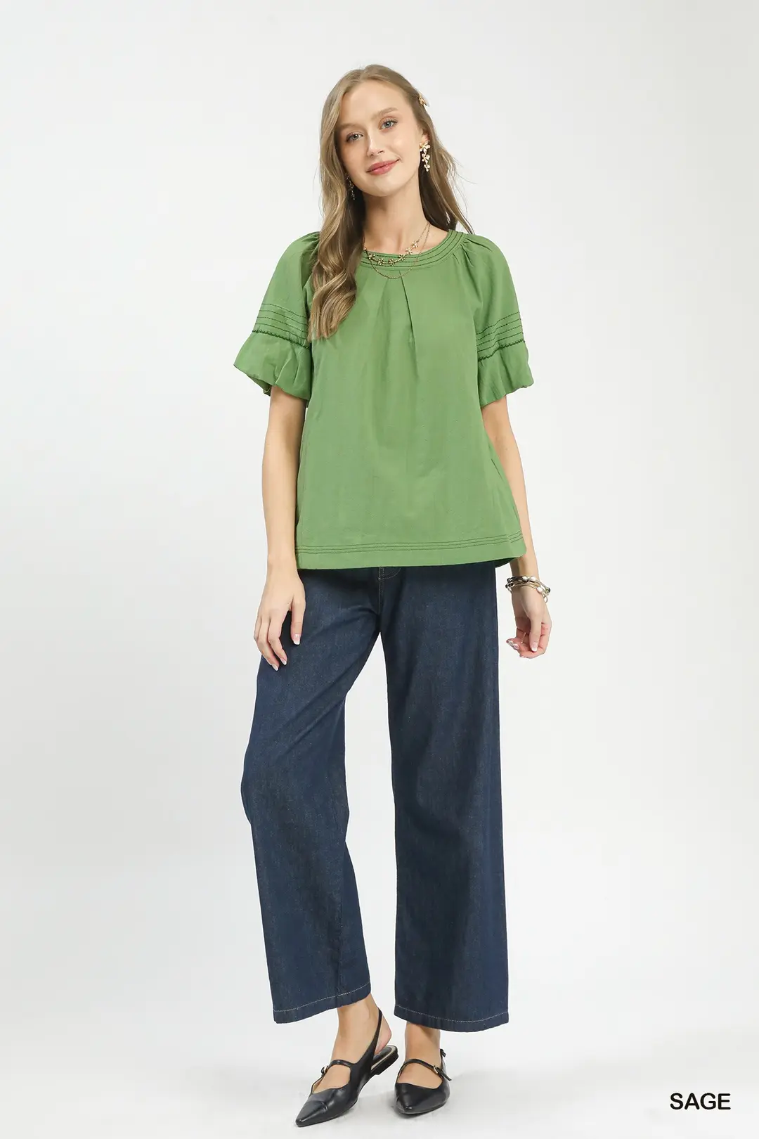 Umgee Round Neck Puff Sleeve Top with Contrast Stitch Detail