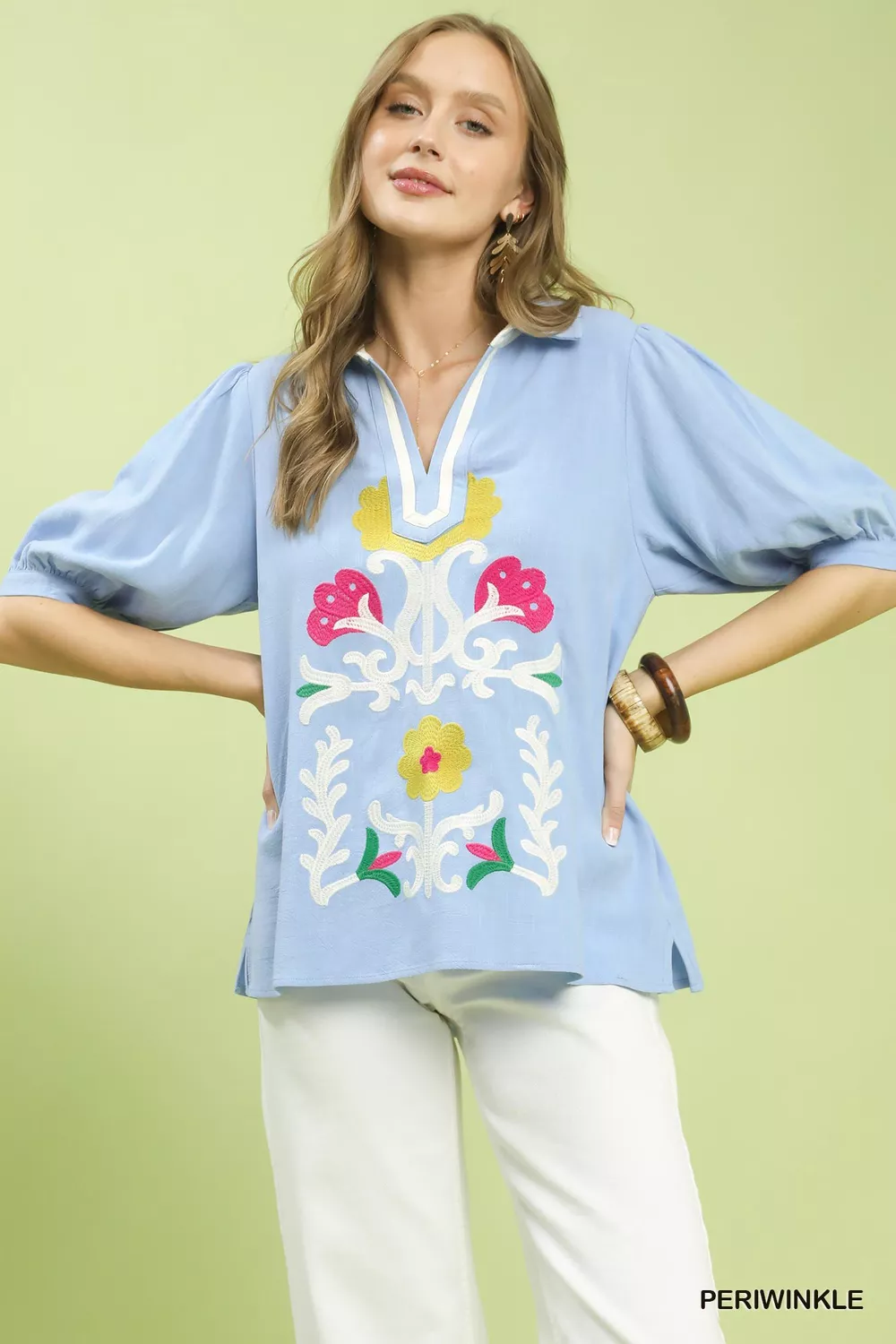 The Mixed Media V-Neck Print Top is a versatile and stylish piece for your wardrobe. Crafted from linen, this top offers a lightweight and breathable feel. The half sleeves with subtle elastic cuffs provide a comfortable and flattering fit. Featuring a split V-neck design and embroidered details, this top exudes a chic and elevated look. Perfect for pairing with jeans or shorts, this top is ideal for both casual and dressier occasions. Elevate your outfit with the sophisticated and on-trend Mixed Media V-Neck Print Top for a fashionable and polished ensemble.