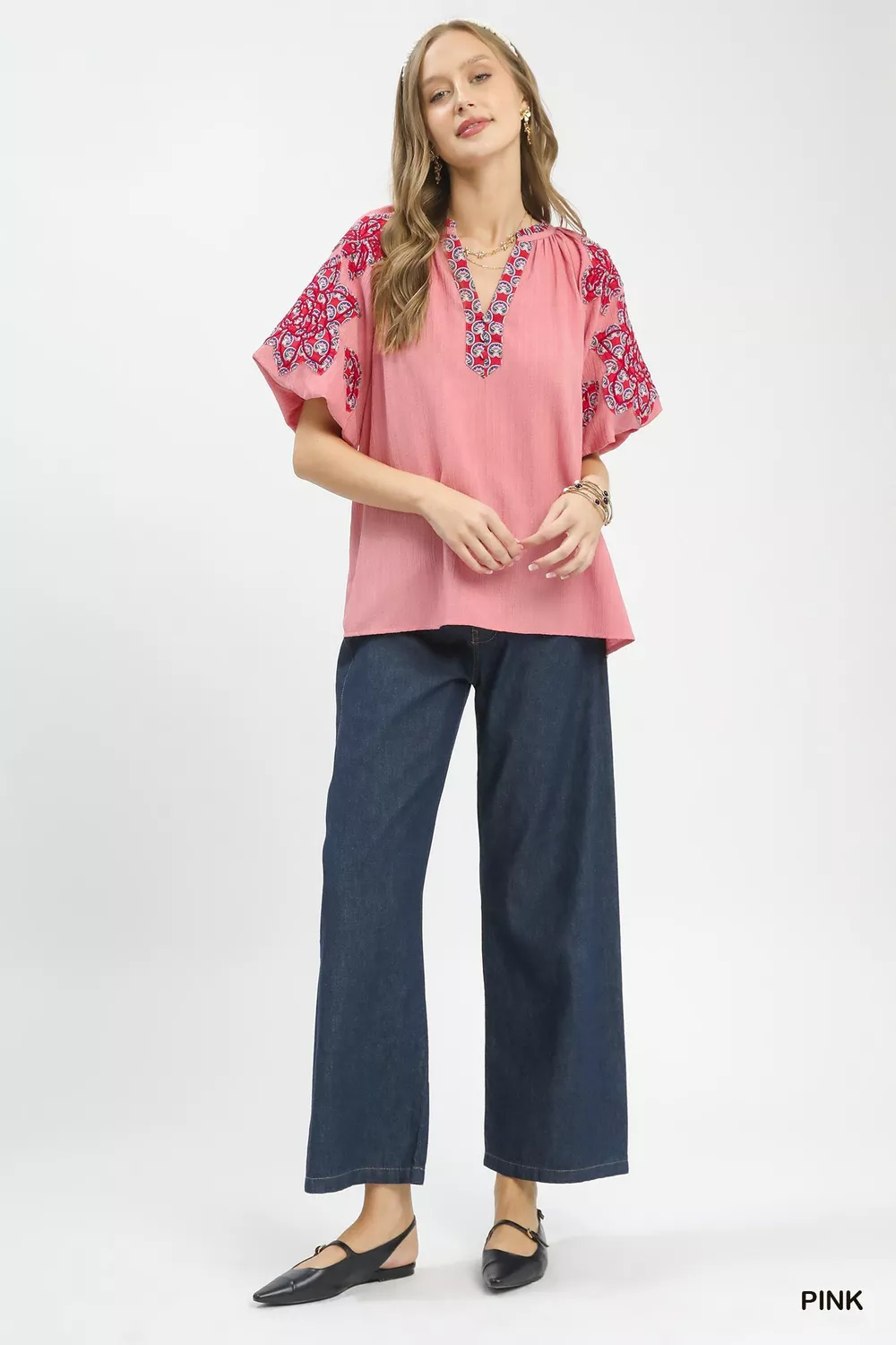 Umgee Embroidered Sleeve Contrast Trim Top
